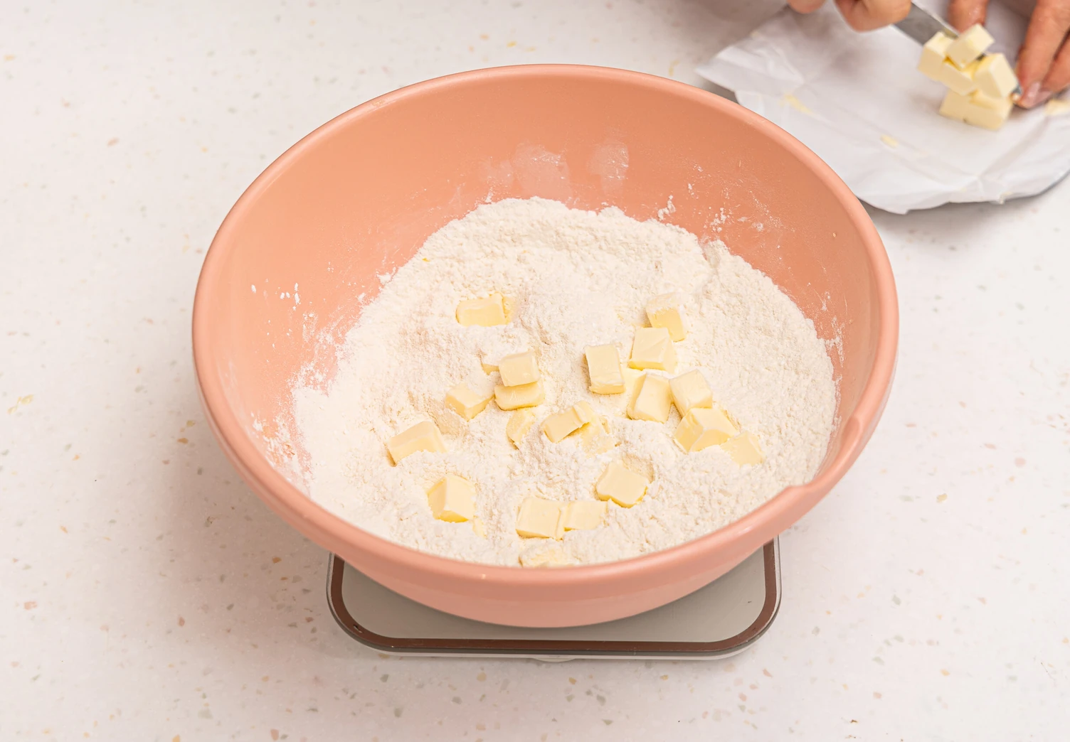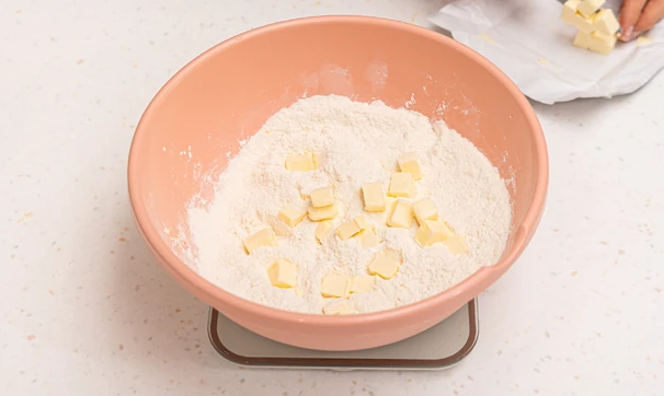 Смешайте муку, цедру и сахарную пудру в миске и порубите в неё кубиками холодное сливочное масло. Тщательно перетрите эти ингредиенты руками, чтобы получилась мелкая крошка.