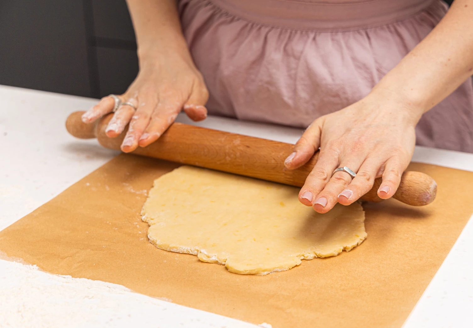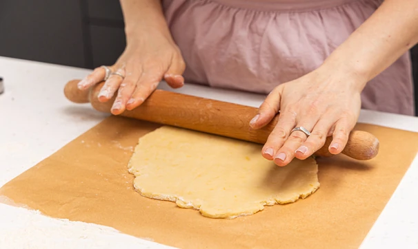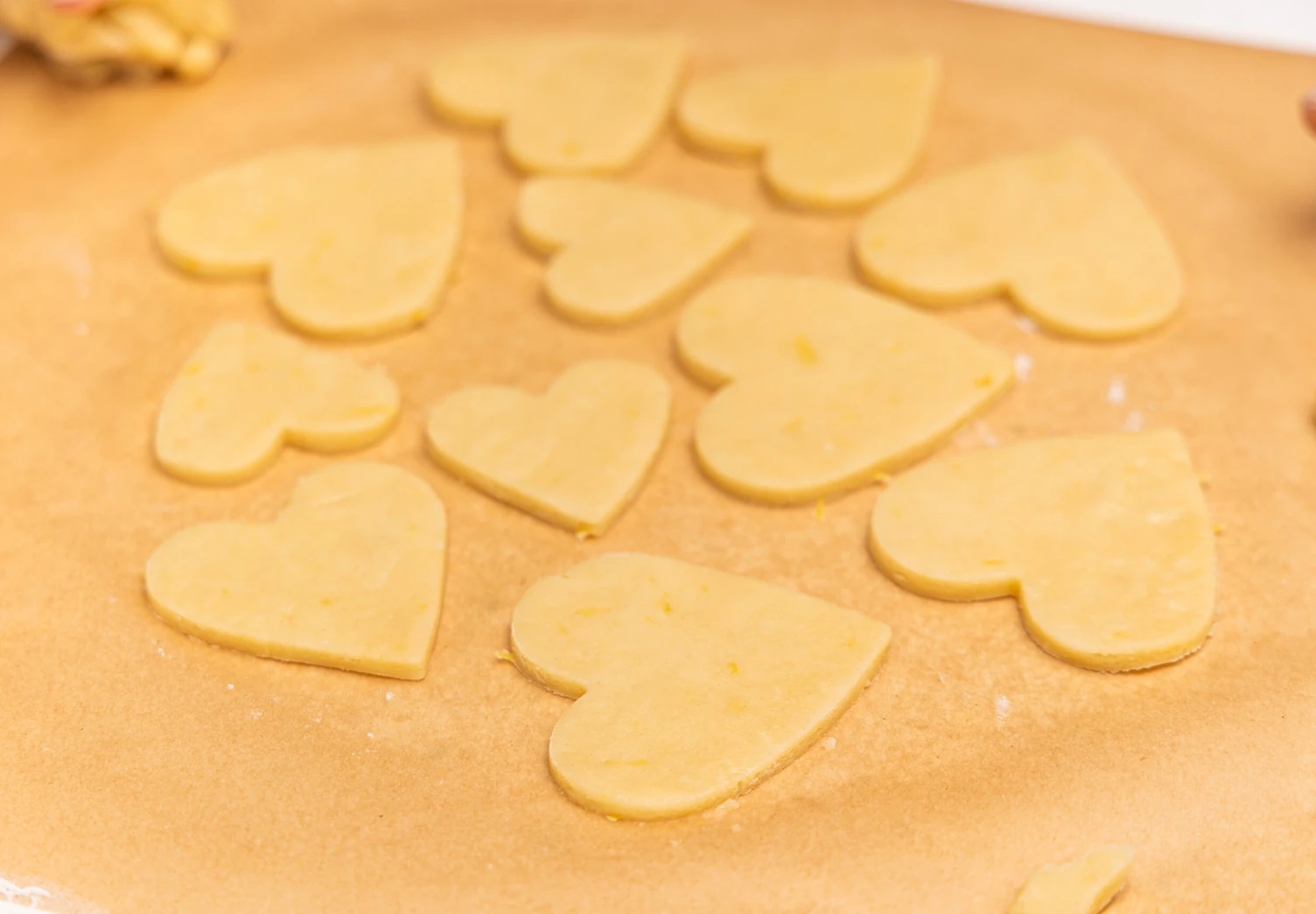 Охлаждённое тесто раскатайте на пергаменте в пласт толщиной 5–6 мм и вырежьте из него фигурки-сердечки.