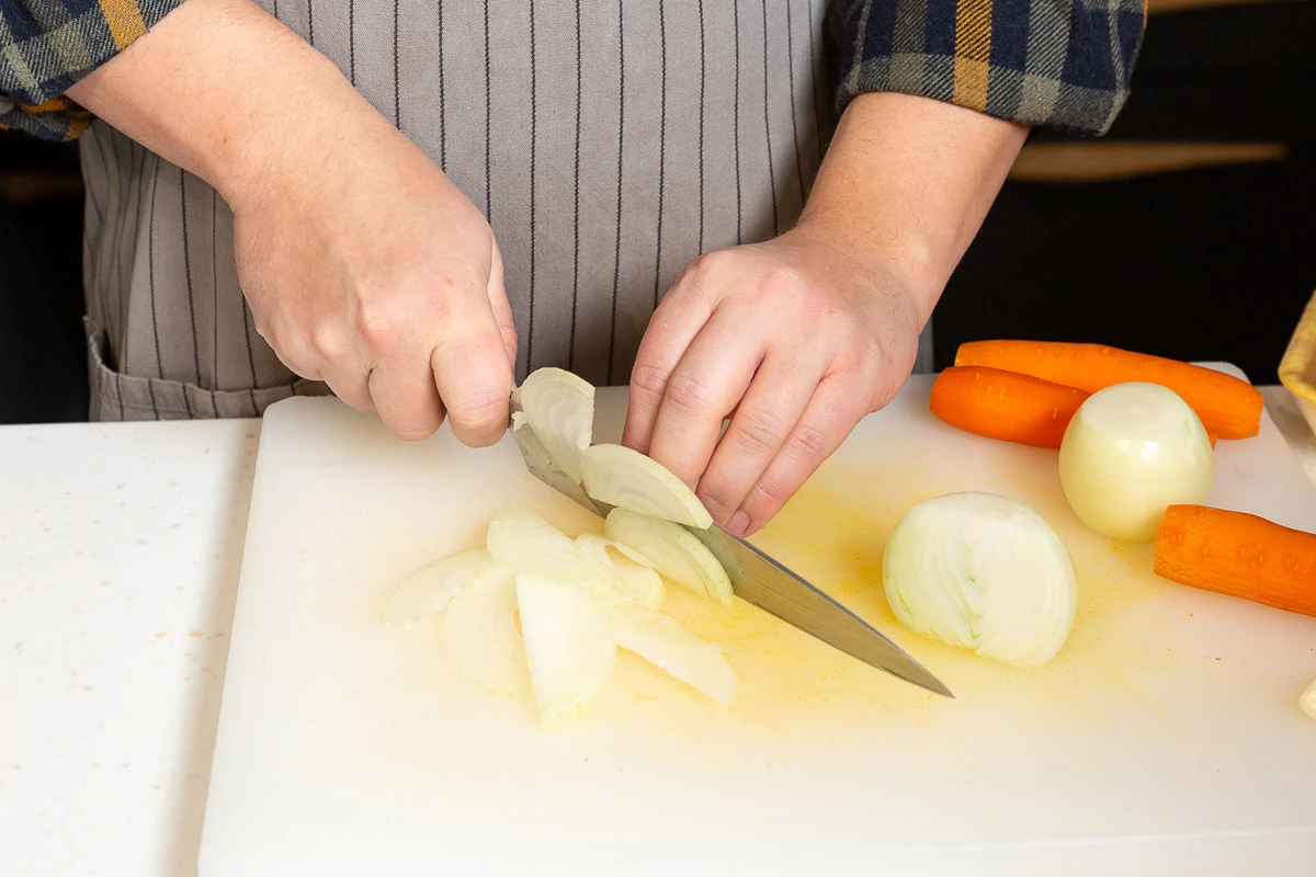 Почистите лук и морковь. Лук нарежьте полукольцами. Морковь нарежьте соломкой или натрите на тёрке для корейской моркови.