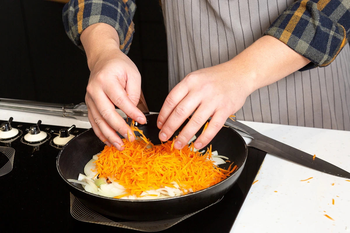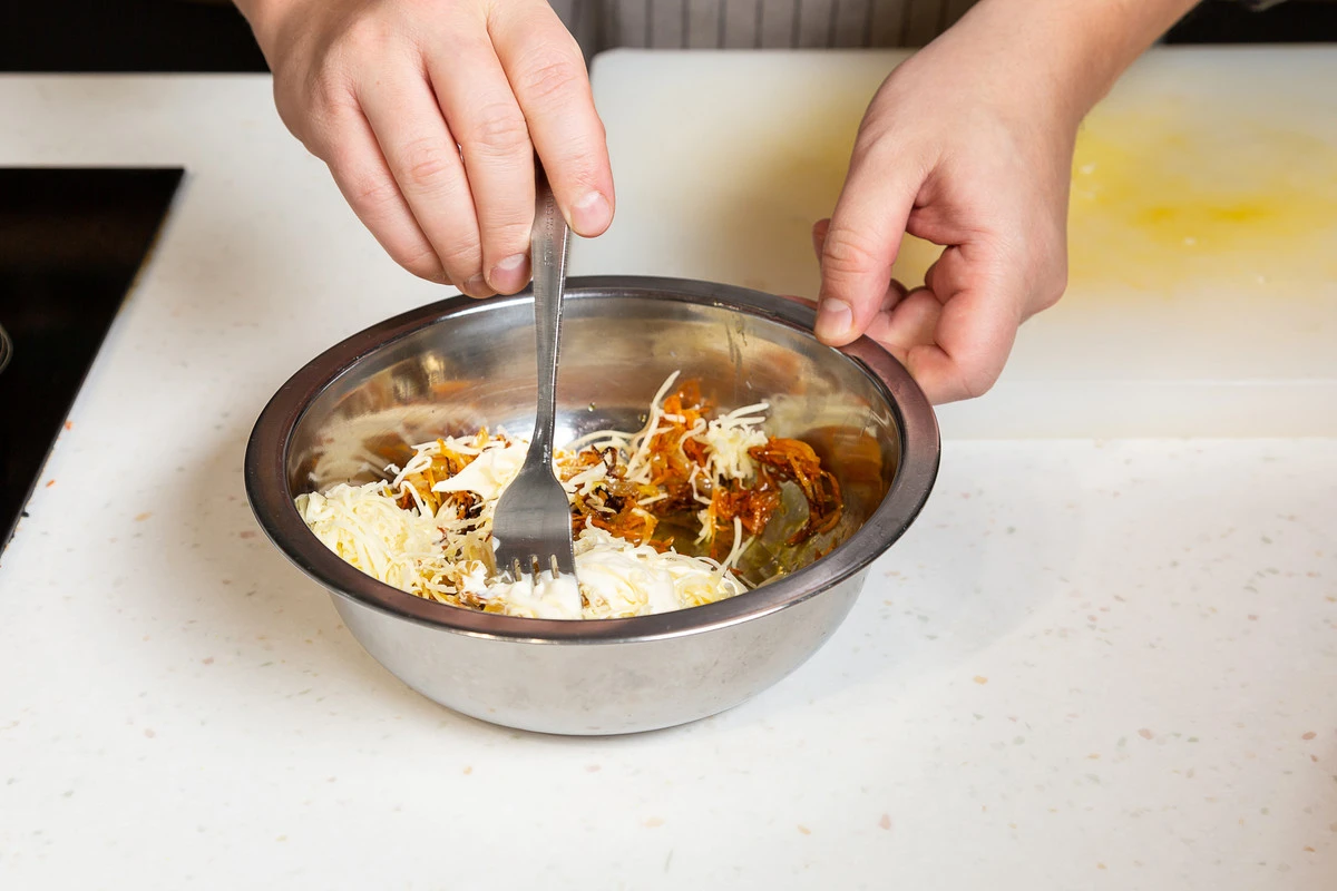 Выложите на сковороду лук, морковь и сливочное масло. Готовьте 5-7 минут, периодически помешивая, до золотистого цвета. Добавьте 100 мл воды и продолжайте готовить до выпаривания жидкости. Снимите с плиты и остудите.