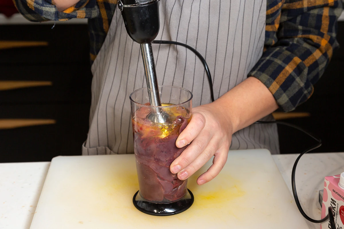 Печень промойте, очистите от плёнок и положите в стакан блендера.