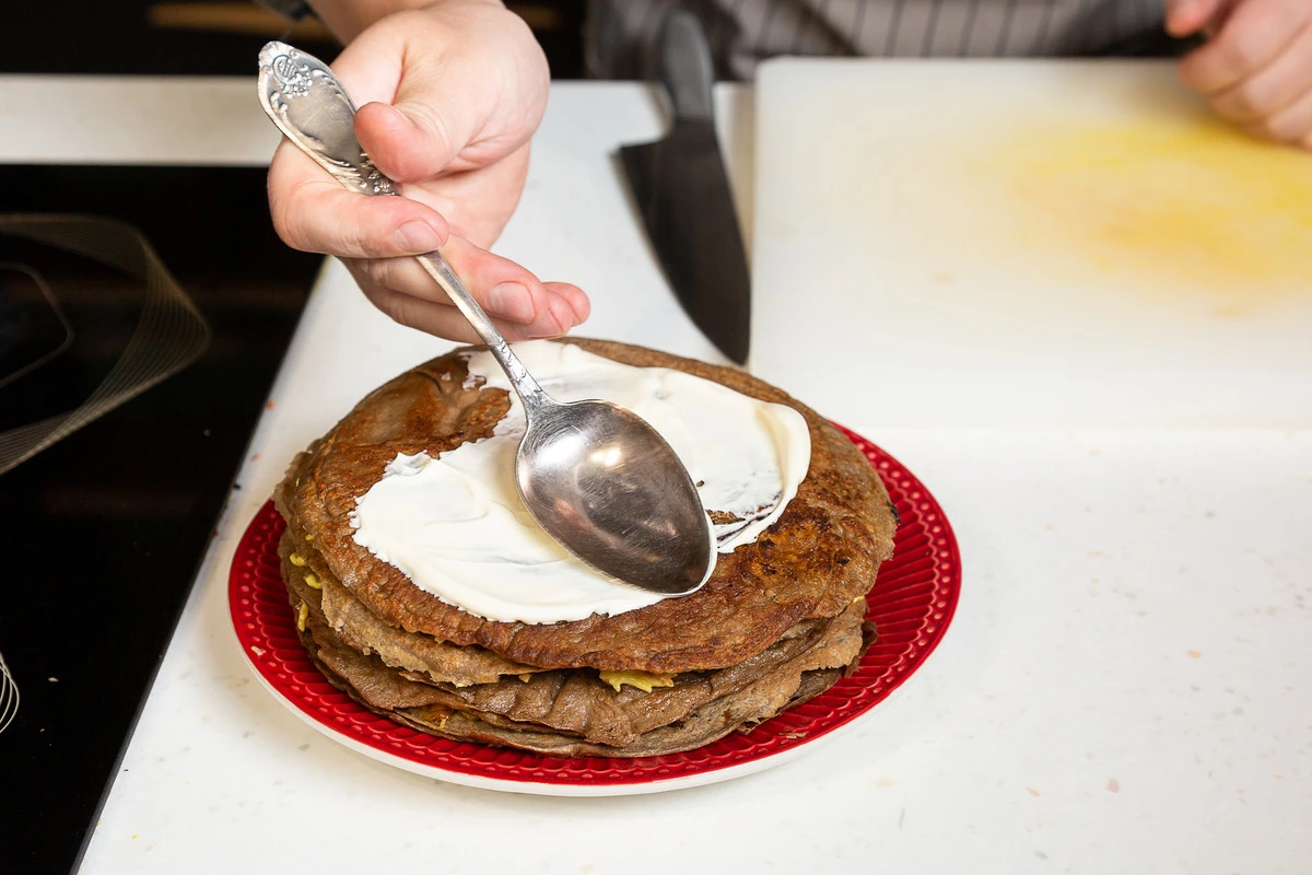 Положите на тарелку один печёночный блин, сверху выложите часть начинки, разровняйте. Повторите для всех оставшихся блинов и начинки. Верхним слоем должен быть блин без начинки.