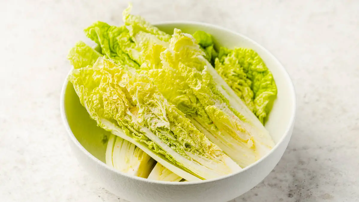 Кочан пекинской капусты разрежьте на четвертинки, промойте, сложите в миску и засыпьте солью, тщательно просаливая между листьями. Оставьте на 2 часа.