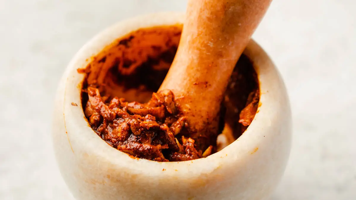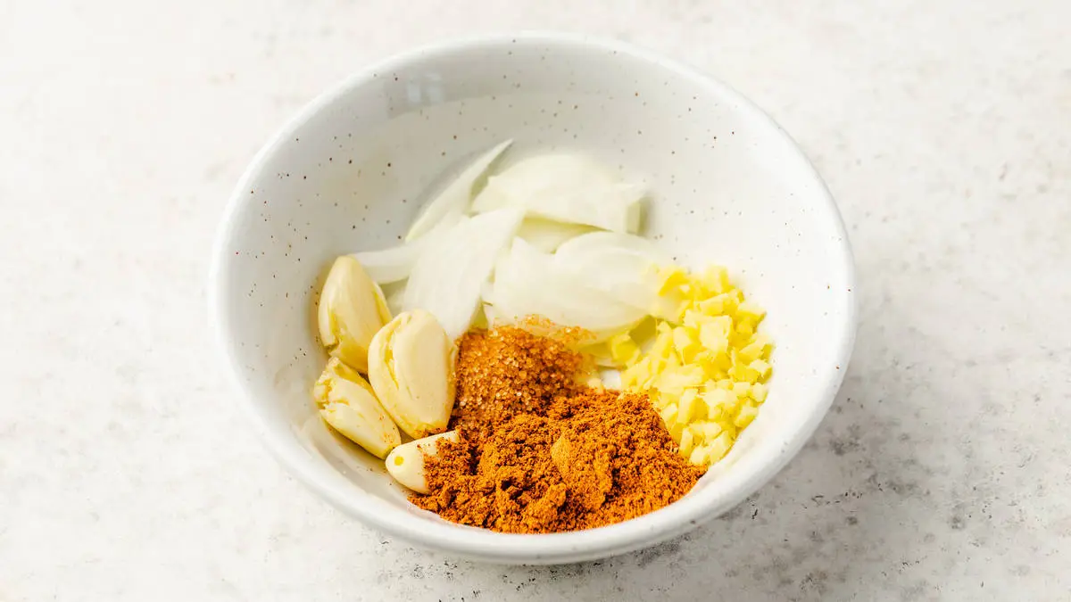 Для острой пасты смешайте лук, чеснок, имбирь, сахар и молотый перец чили.