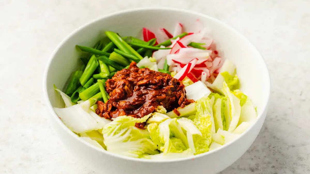 Когда капуста настоялась в соли, промойте её тщательно от всей лишней соли, нарежьте средними кусками. Редис и зелёный лук нарежьте крупными перьями. Всё вместе смешайте с острой пастой (лучше использовать перчатки).