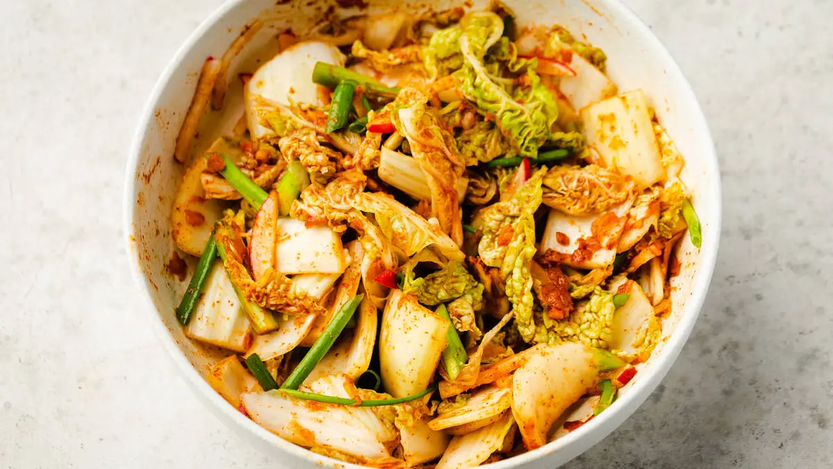 Сложите кимчи в контейнер, накройте крышкой и оставьте при комнатной температуре примерно на сутки.