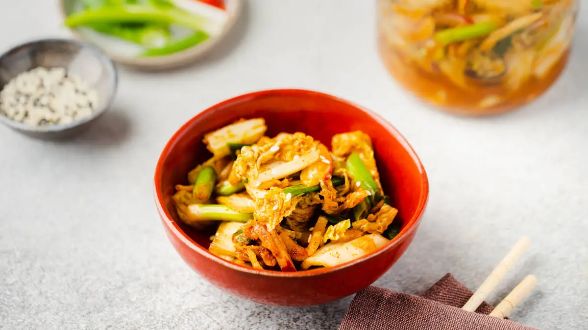 Традиционная корейская закуска из капусты, выдержанной в остром соусе.