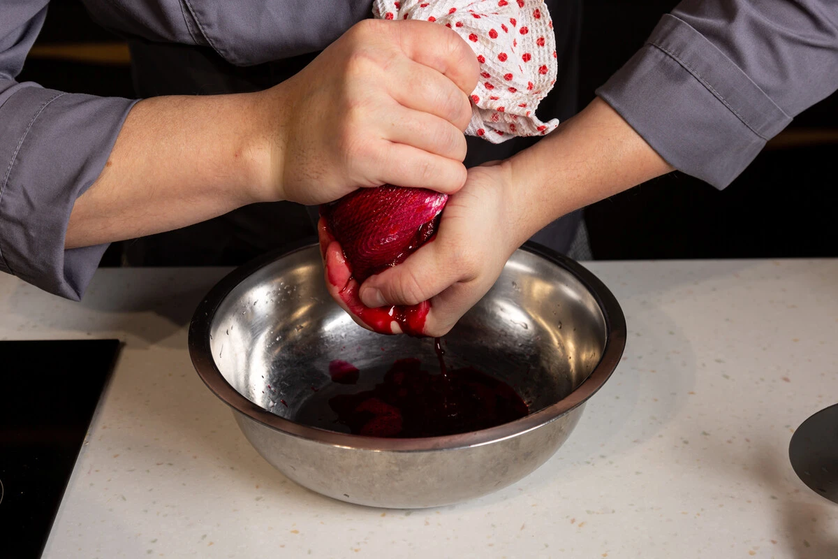 Свёклу натрите на крупной тёрке в вафельное полотенце и отожмите сок в миску. Для теста понадобится 120 мл.
