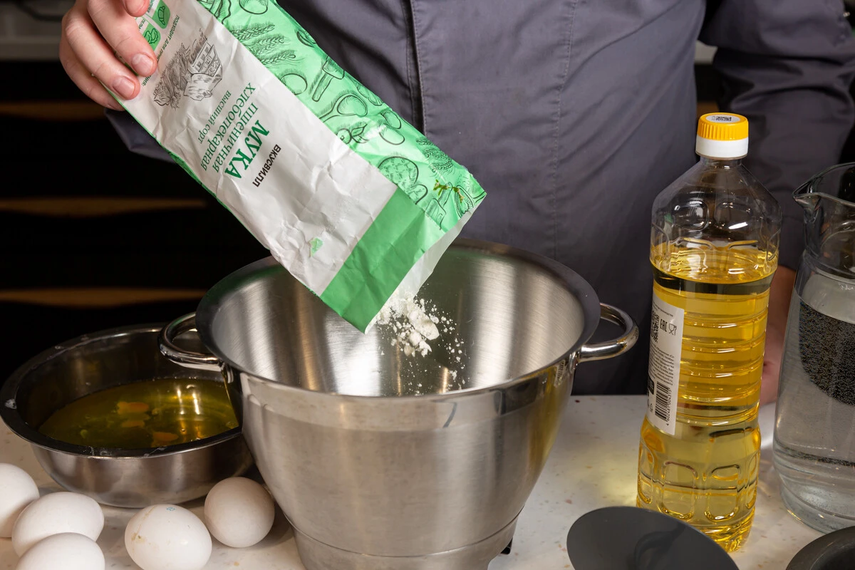 Смешайте муку, соль и желтки руками или с помощью миксера.
