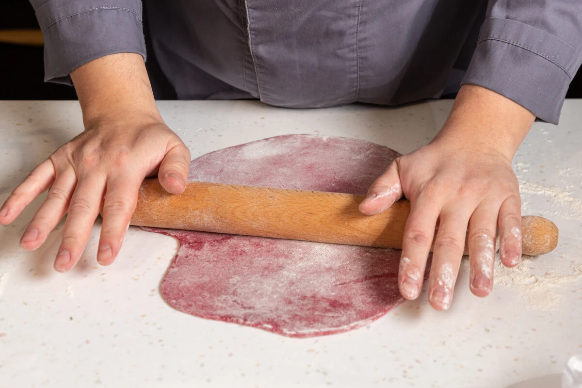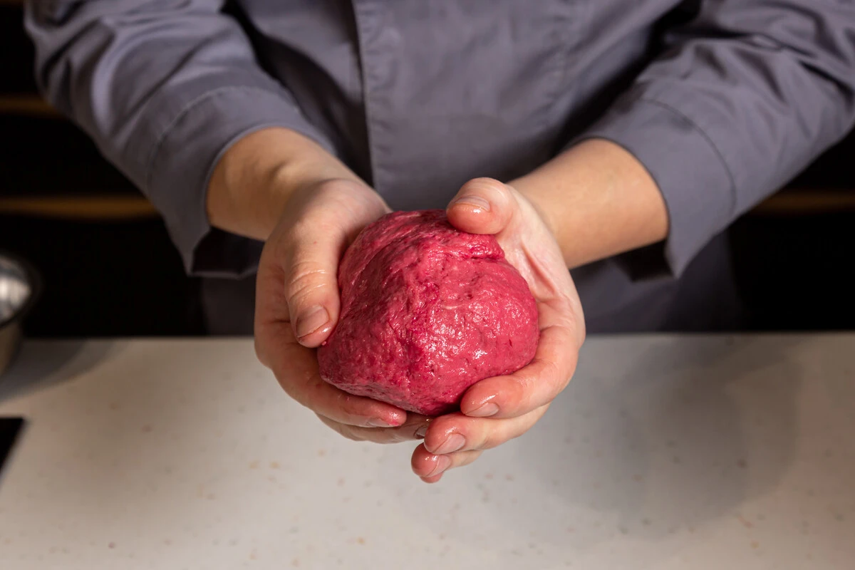 Добавьте растительное масло, воду, свекольный сок и замесите тесто. Заверните его в плёнку и уберите в холодильник хотя бы на полчаса.
