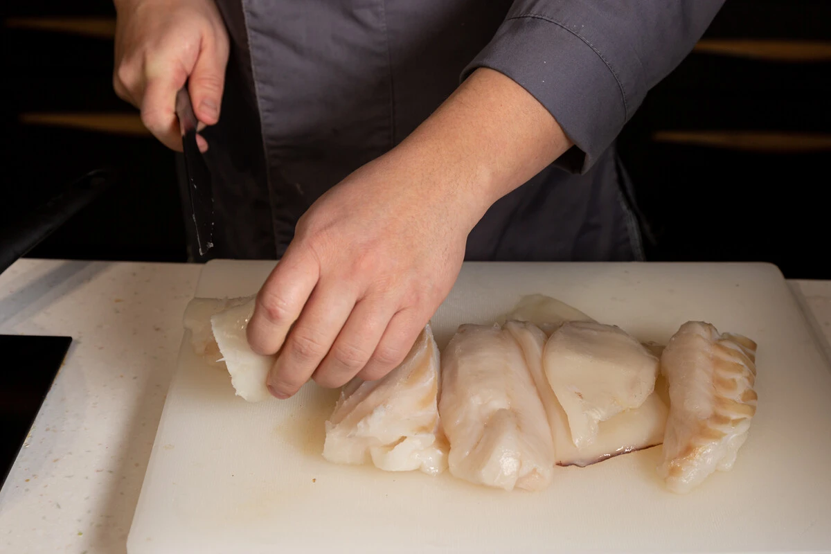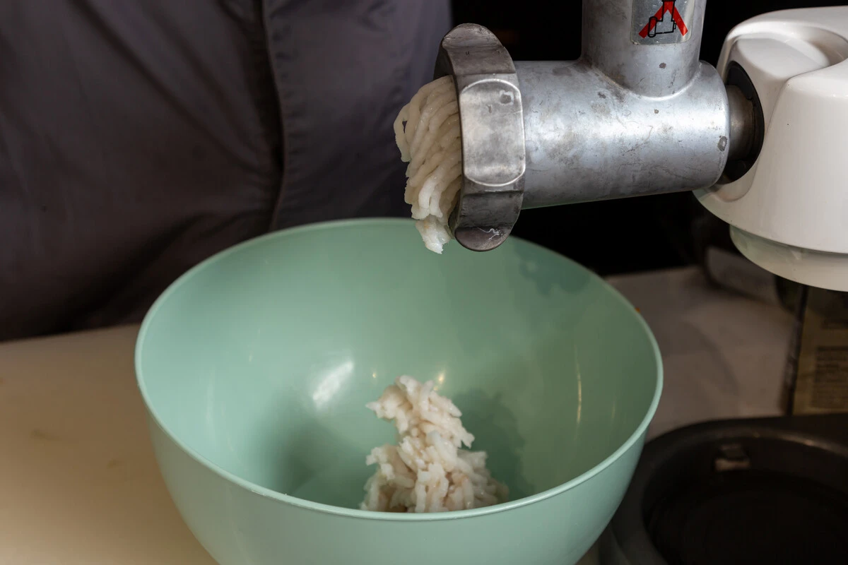 Пропустите через мясорубку с мелкой решёткой филе трески, кальмара, сельдерей и лук.