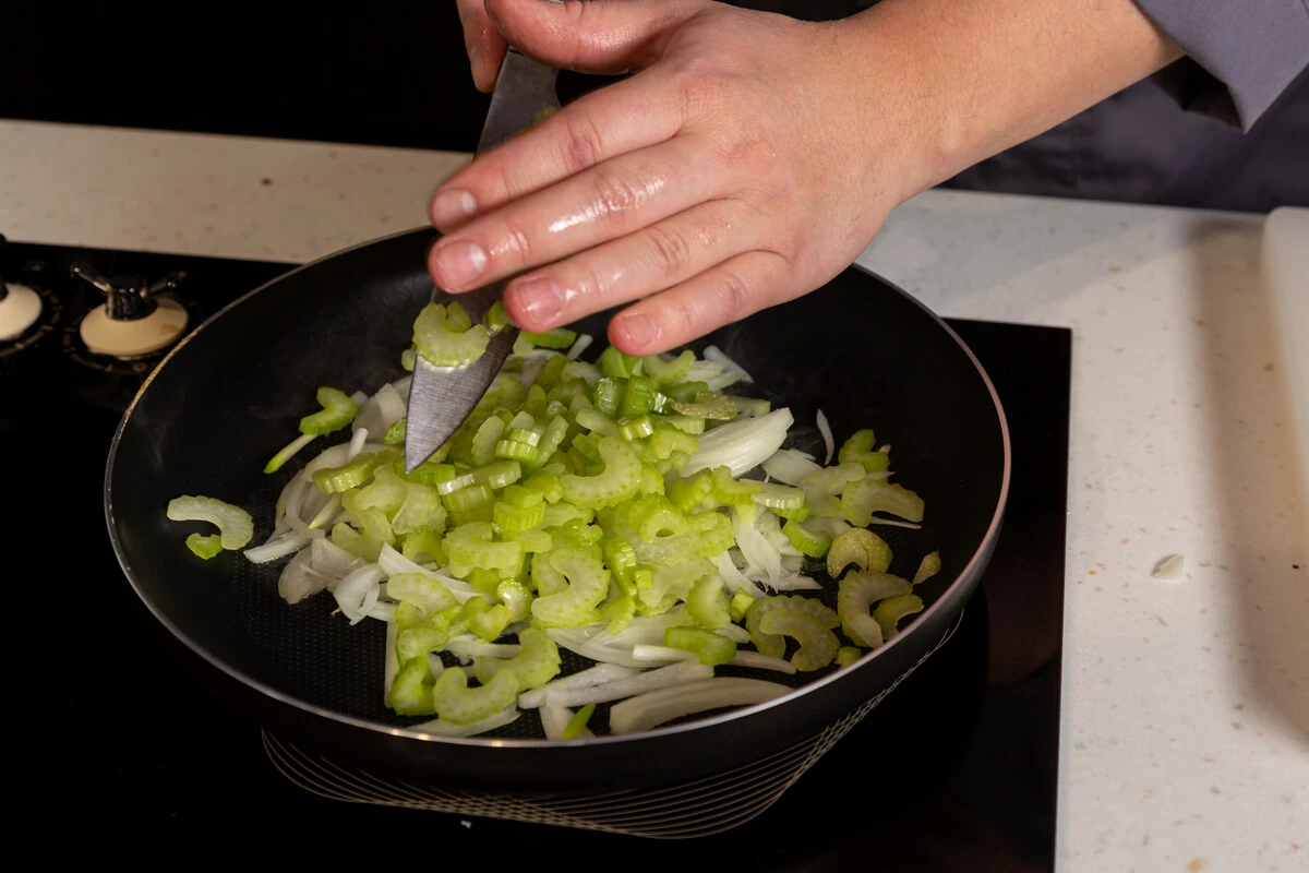 Сельдерей и лук нарубите мелким кубиком и обжарьте на растительном масле до золотистого цвета.