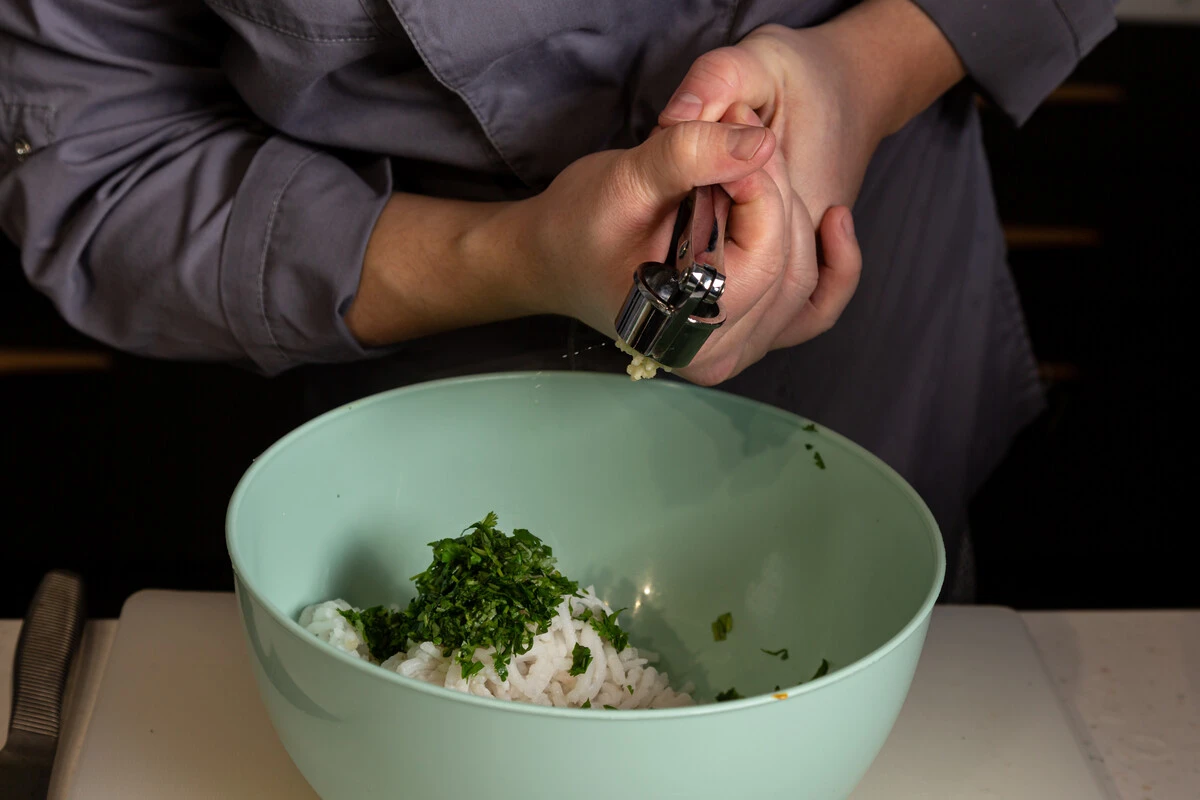 Смешайте полученный фарш с рубленой кинзой, чесноком и специями.