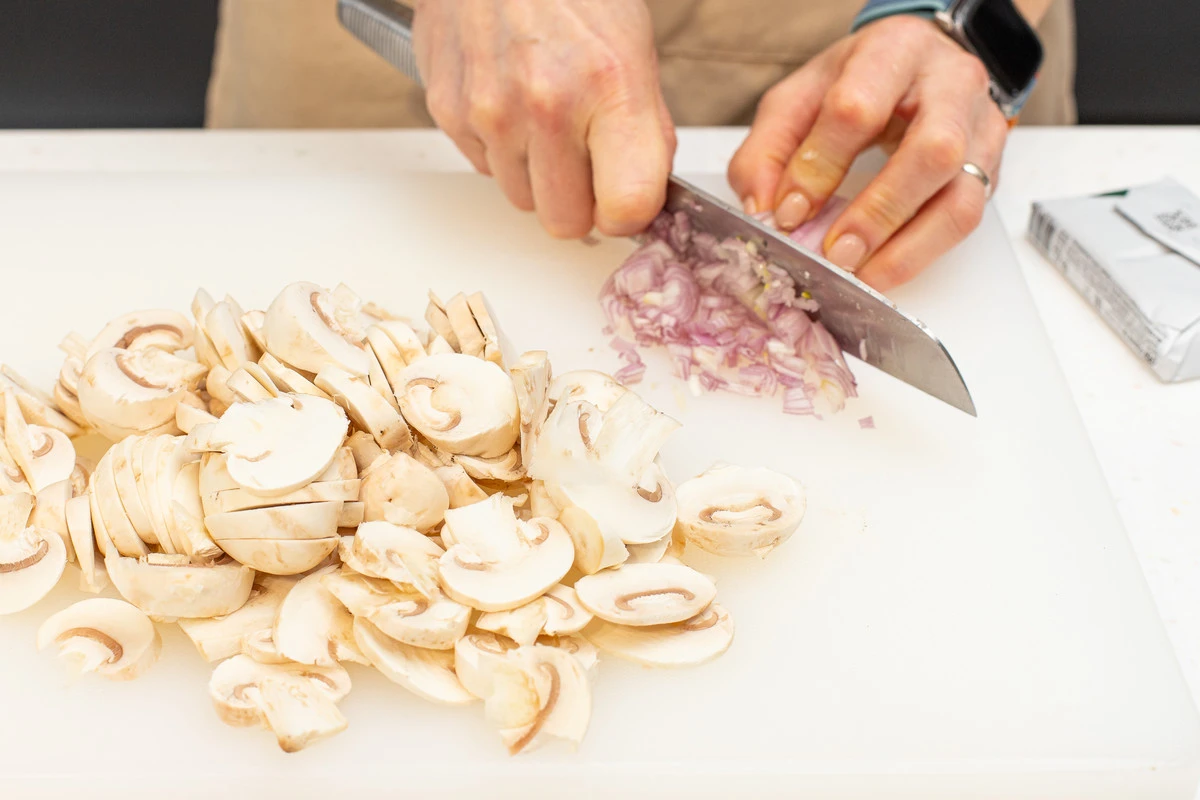 Шампиньоны при необходимости очистите от грязи салфеткой или быстро промойте и обсушите, не замачивая. Нарежьте пластинами. Лук и чеснок почистите и мелко нарежьте.