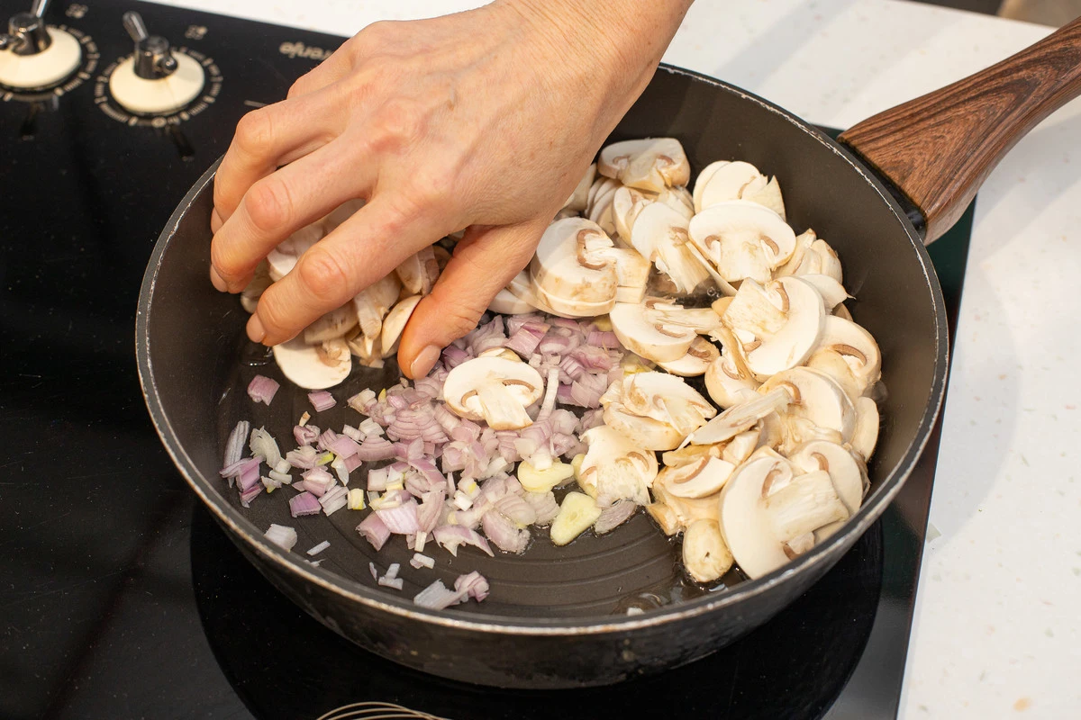 Разогрейте сковороду с растительным маслом, выложите грибы, лук и чеснок. Добавьте молотый кориандр, чёрный перец. Готовьте 7-8 минут, периодически помешивая. Добавьте ¼ ч. л. соли или по вкусу, перемешайте.