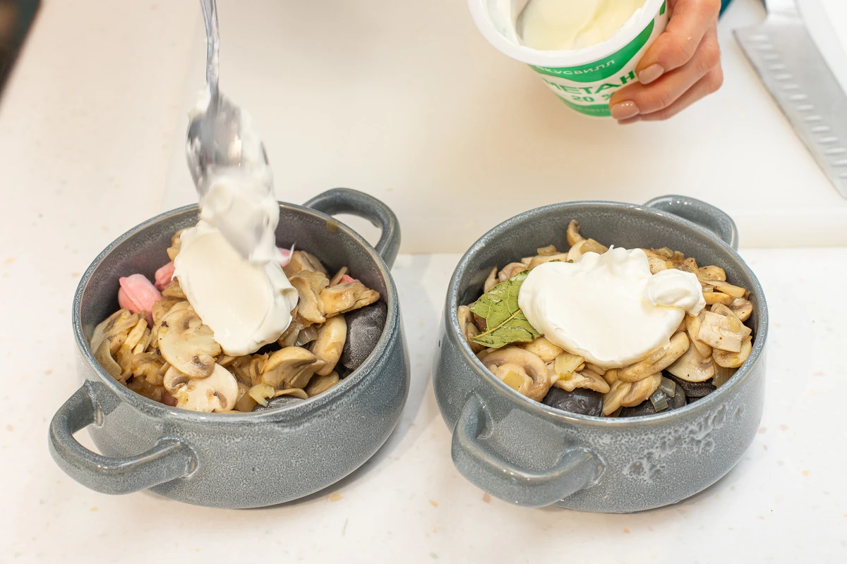 На грибы положите сметану в равных порциях в каждый горшочек и распределите по поверхности.