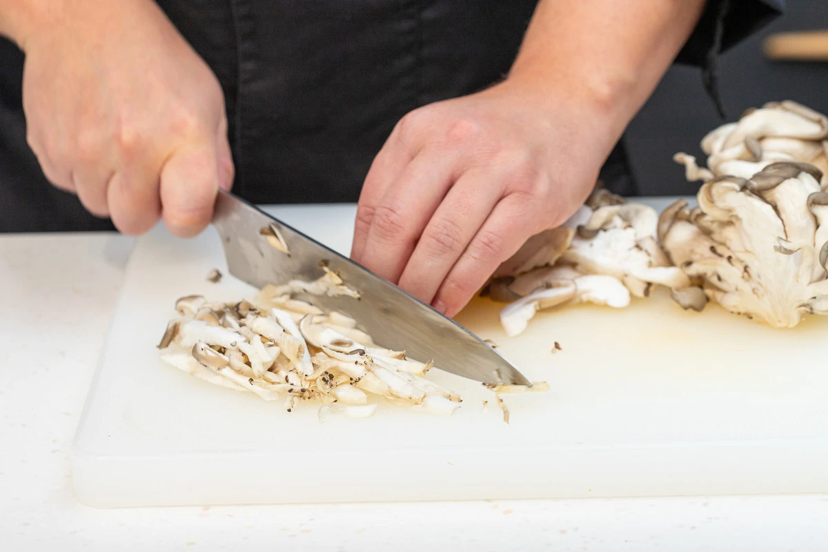 Разогрейте сковороду с оливковым маслом и обжарьте лук на сильном огне, помешивая. Затем добавьте вёшенки и готовьте в течение ориентировочно 20 минут, периодически помешивая. Для более быстрого размягчения грибов можно добавить немного воды и выпарить при приготовлении. Поперчите.
