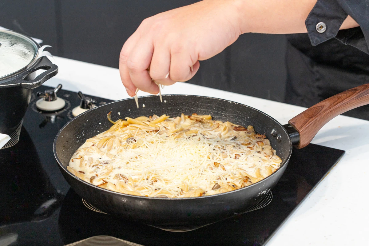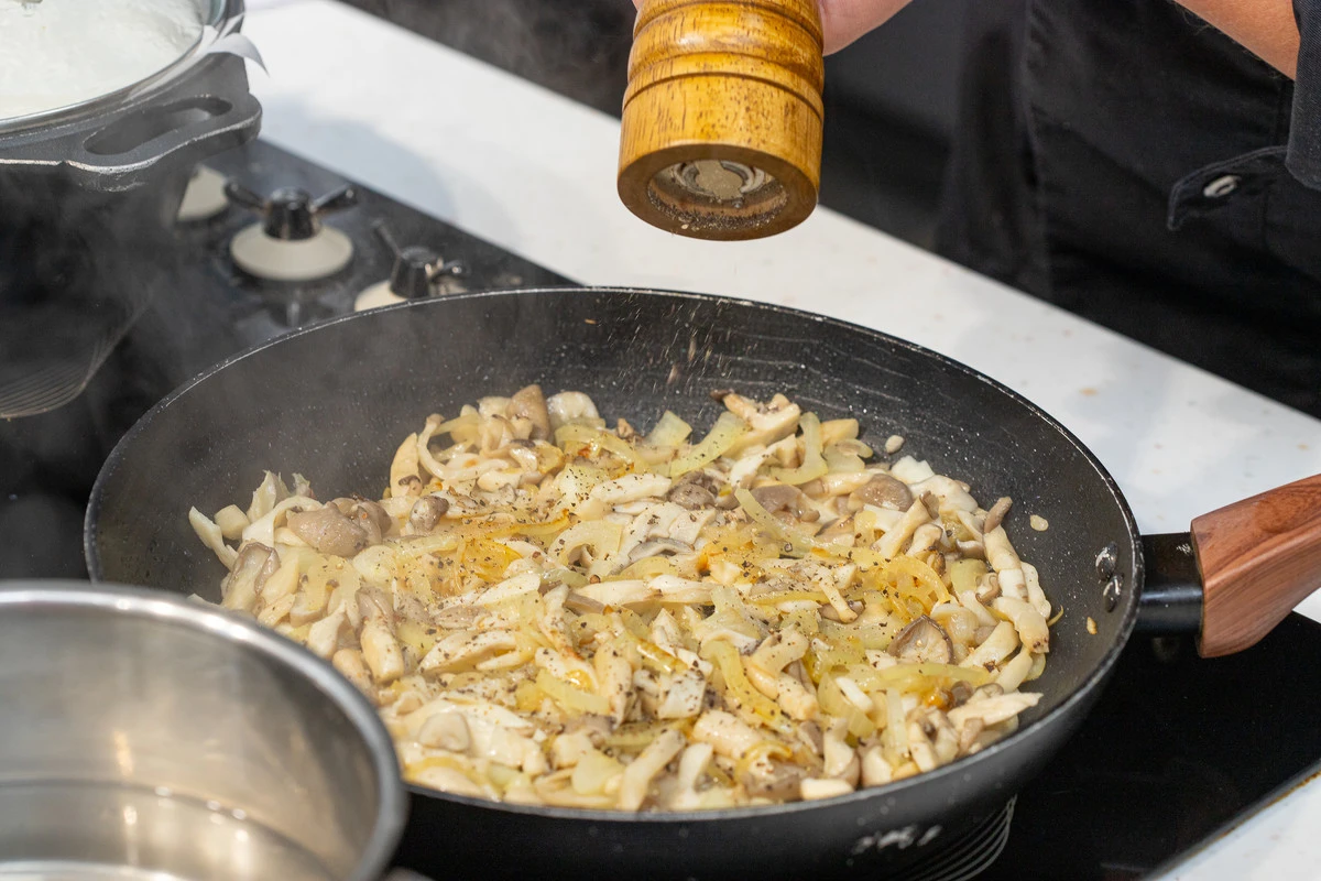 Ещё одно интересное блюдо для любителей пасты и простых рецептов — перечная паста с вёшенками в горчично-сливочном соусе и сыром. Для его приготовления мы взяли макароны джемелли из цельнозерновой муки — благодаря своей форме, они лучше удерживают соусы, а значит, блюдо получается ещё вкуснее. Но вы, конечно, можете использовать любой любимый вид пасты.