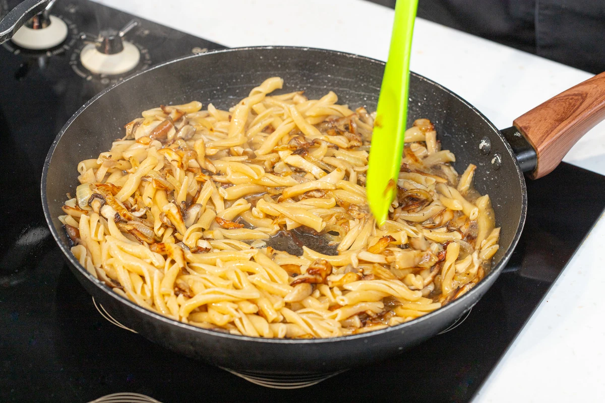 Пасту джемелли отварите в кипящей подсоленной воде до состояния аль денте, согласно инструкции на упаковке. Добавьте к грибам с луком, влейте немного воды, перемешайте и готовьте пару минут.