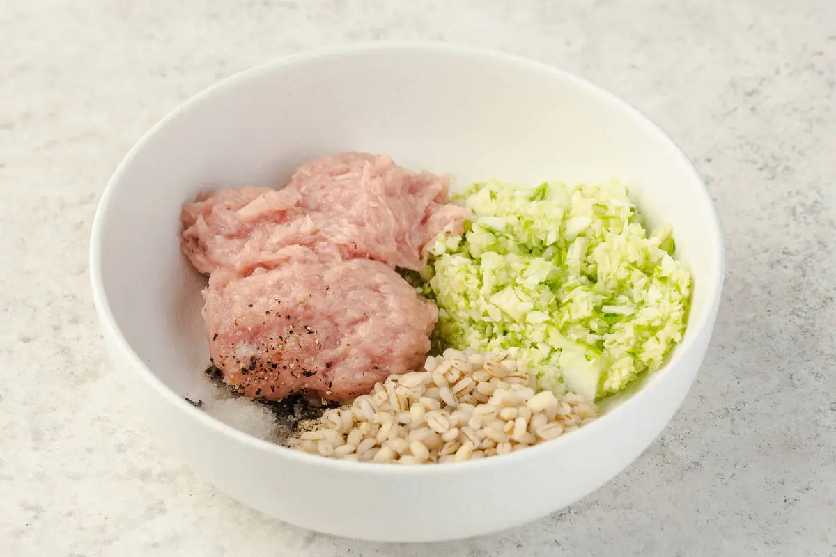 Кабачок измельчите в блендере или на тёрке. Смешайте куриный фарш, кабачок, перловку, соль и перец.