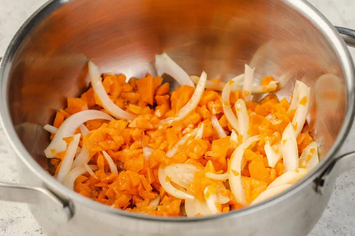 Морковь измельчите на тёрке или в блендере, лук нарежьте полукольцами. На дно кастрюли налейте ложку подсолнечного масла (можно использовать нерафинированное для вкуса), добавьте половину моркови и лука.