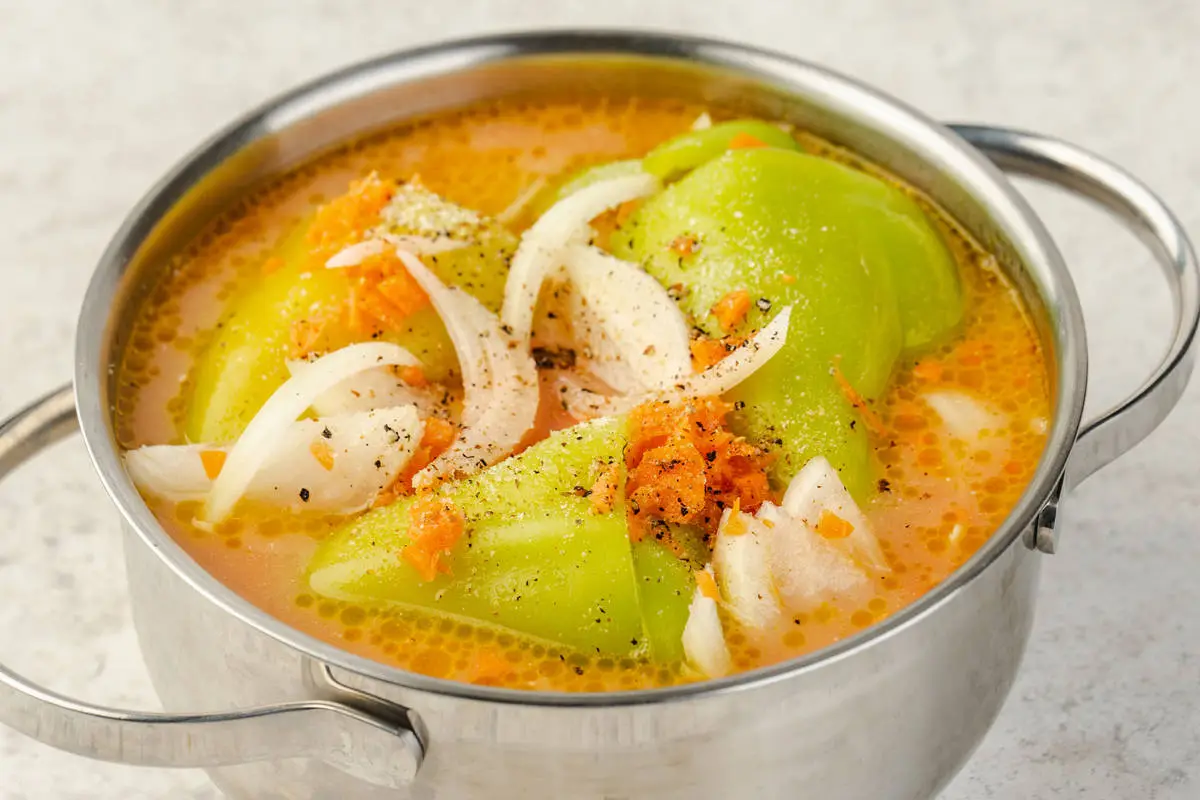 Накройте неплотно крышкой, доведите до кипения, убавьте огонь и готовьте 30-35 минут. Подавайте с бульоном и овощами в нём.