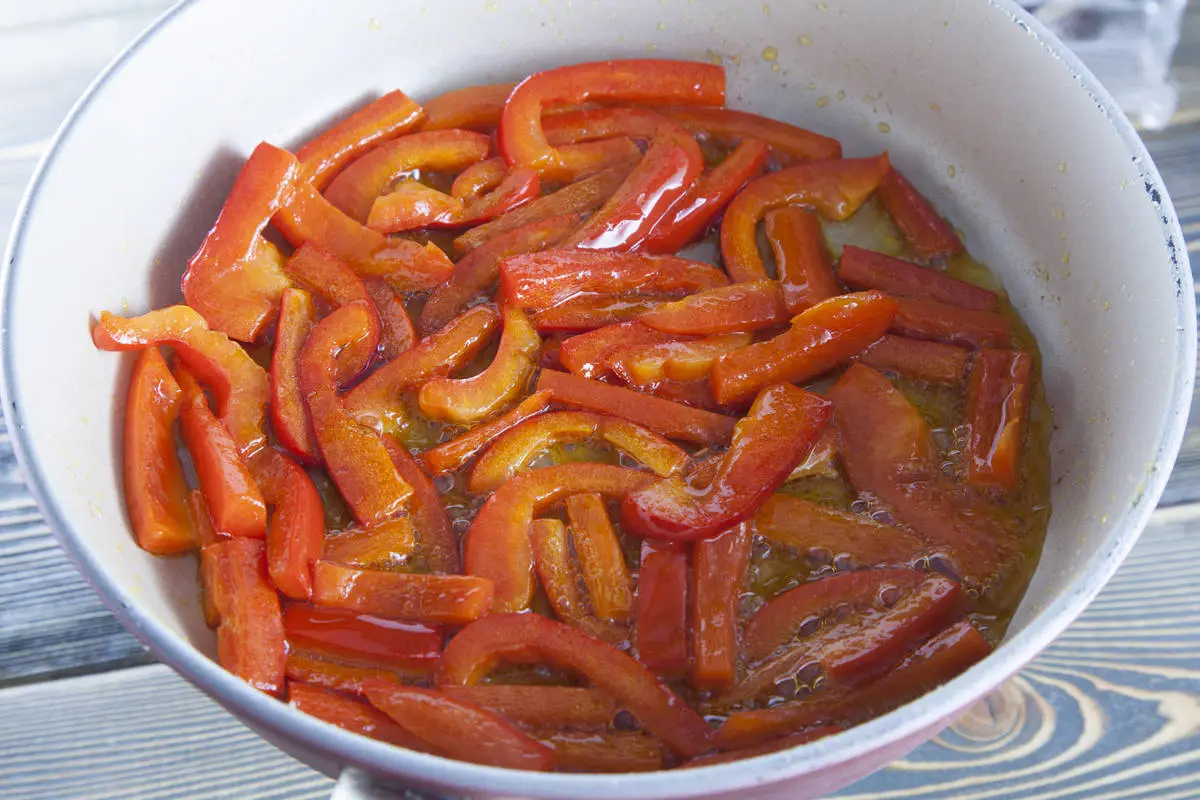 Пока крупа готовится, болгарский перец заверните в фольгу, лук разрежьте на 8 продольных частей и запеките в духовке при 180 градусах до мягкости, дайте остыть, с перца снимите кожицу и порежьте кусочками.