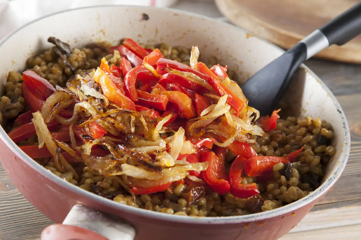 Смешайте лук и перец, добавьте к перловке, перемешайте и прогрейте еще минуту. Подавайте горячей, добавьте большую порцию свежего листового салата и здоровый обед готов!