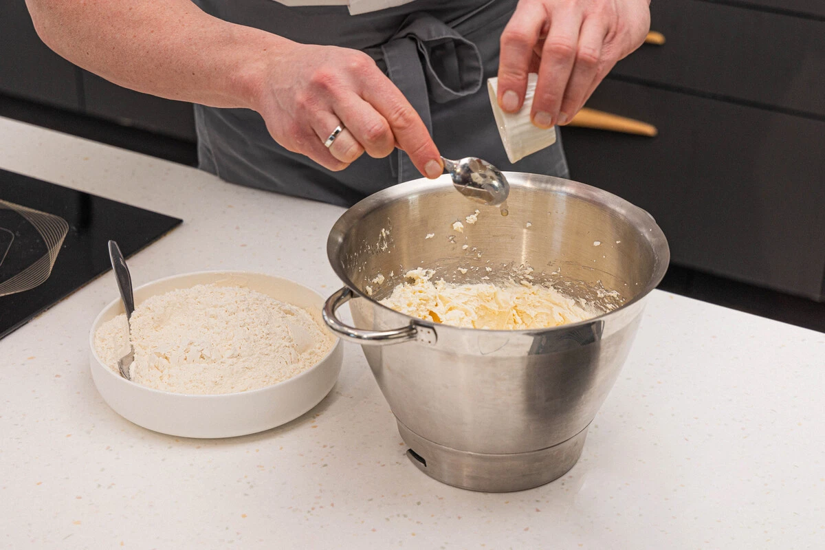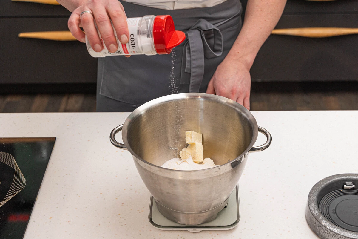 Сливочное масло комнатной температуры взбейте с обычным и ванильным сахаром и солью до белой пышной массы.