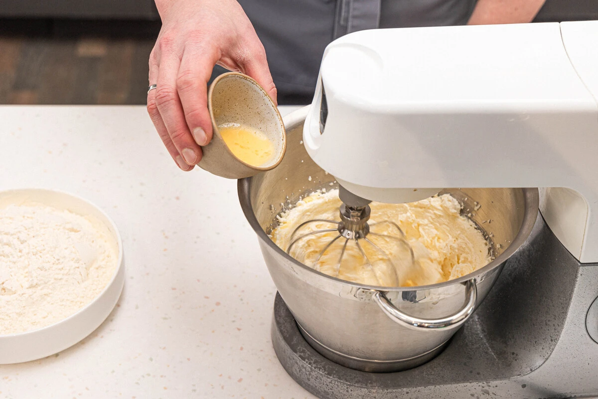 Добавьте к масляной смеси меланж, продолжая взбивать.