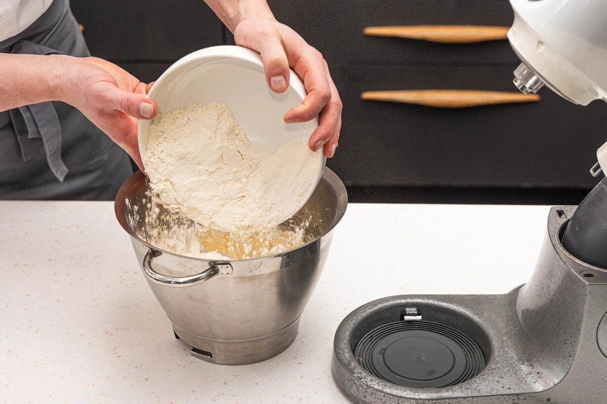 Всыпьте муку и замесите тесто. Не переусердствуйте, иначе оно получится тугим и неэластичным.