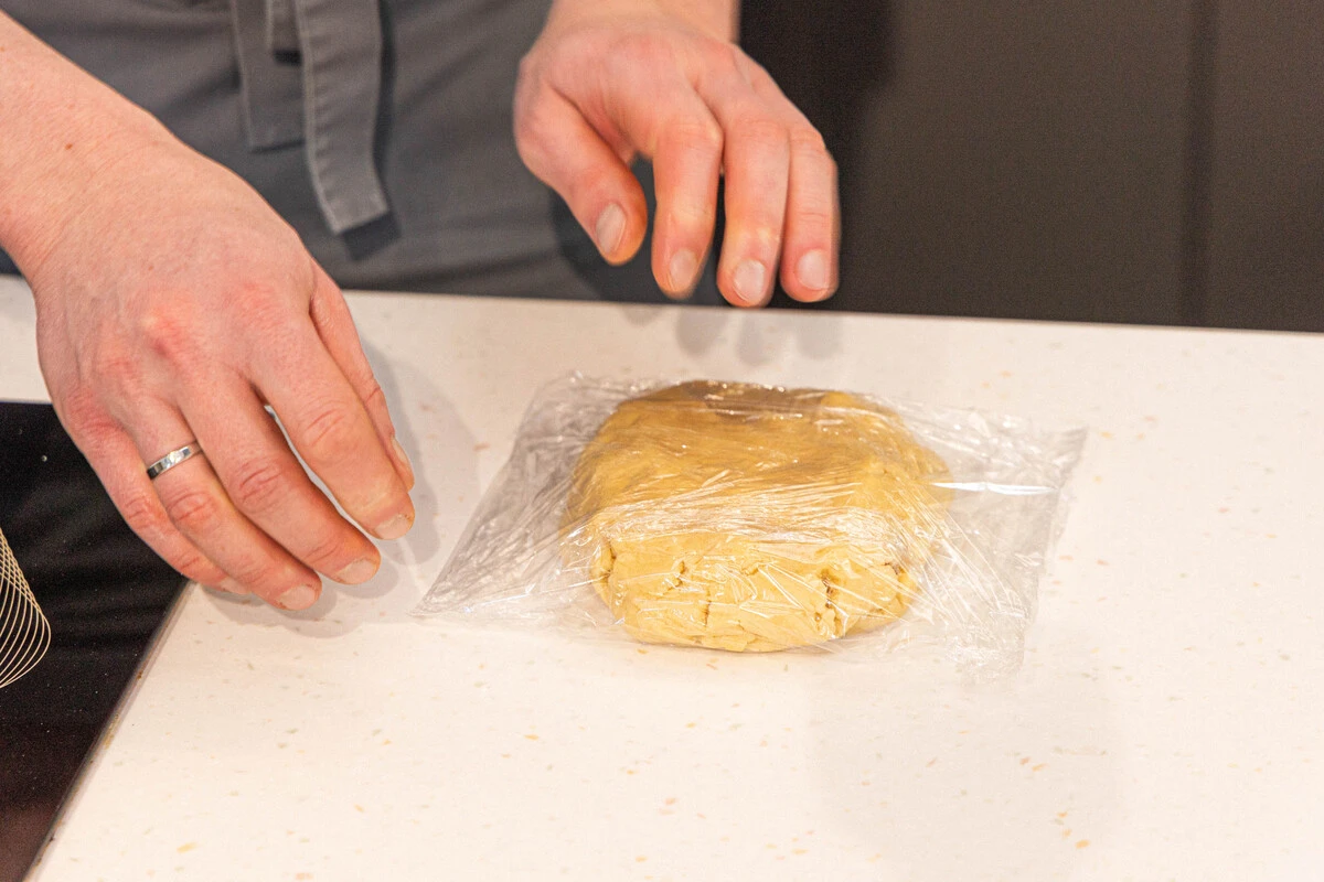 Заверните тесто в плёнку и уберите в холодильник на полчаса.