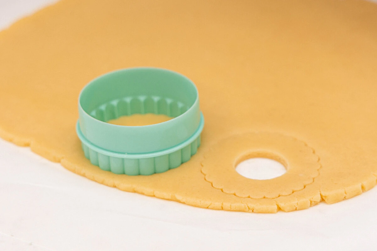 Раскатайте на пергаменте тесто толщиной 5–6 мм и вырежьте из него кольца.