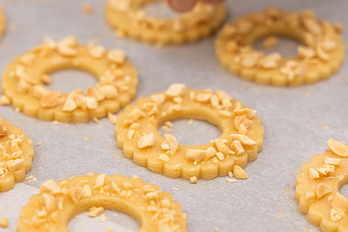 Наверняка вы помните эти хрустящие, щедро посыпанные орехами кольца из меню школьных столовых? А если нет, то самое время их попробовать! Это именно тот случай, когда говоришь себе: ну всё, теперь точно последнее, но рука так и тянется за новым колечком.