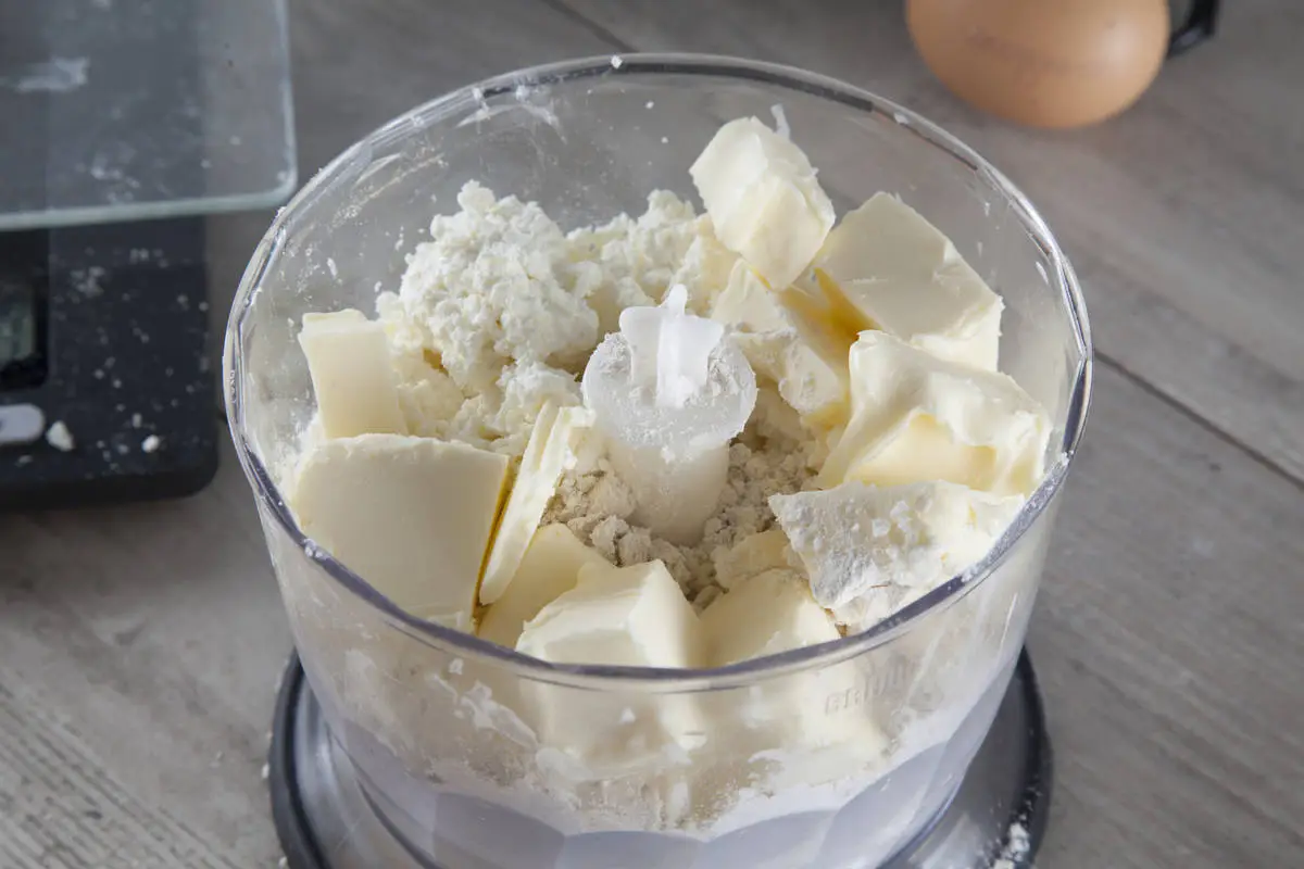 Для теста сложите муку, соль, кубики холодного масла (130 г) и творог в чашу блендера, порубите в крошку, но не слишком мелко.