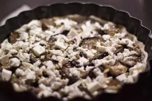Карамелизированные баклажаны разложите на слоеном тесте, полейте оставшейся карамелью, покрошите сверху сыр и фисташки. Выпекайте в духовке при 180С 25-30 минут.