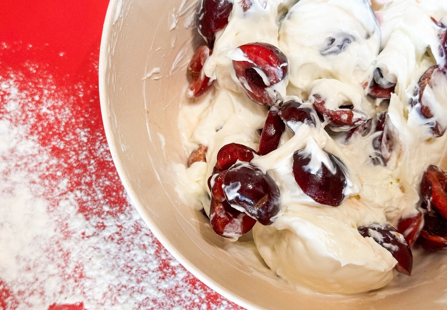 Приготовьте крем: в глубокой миске взбейте творожный сыр до гладкой консистенции, добавьте сахарную пудру и снова взбейте. Отдельно взбейте сливки до полупиков и аккуратно введите их в творожную массу. Добавьте яйцо и хорошо перемешайте. Затем добавьте черешню, предварительно очищенную от косточек и разрезанную пополам.