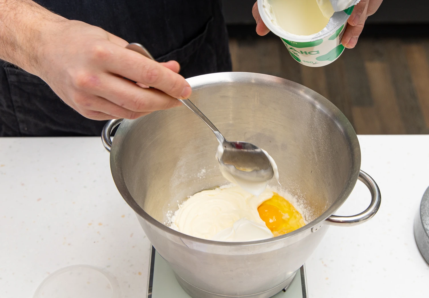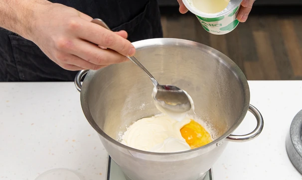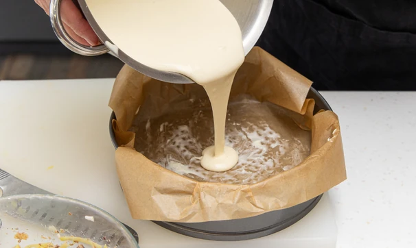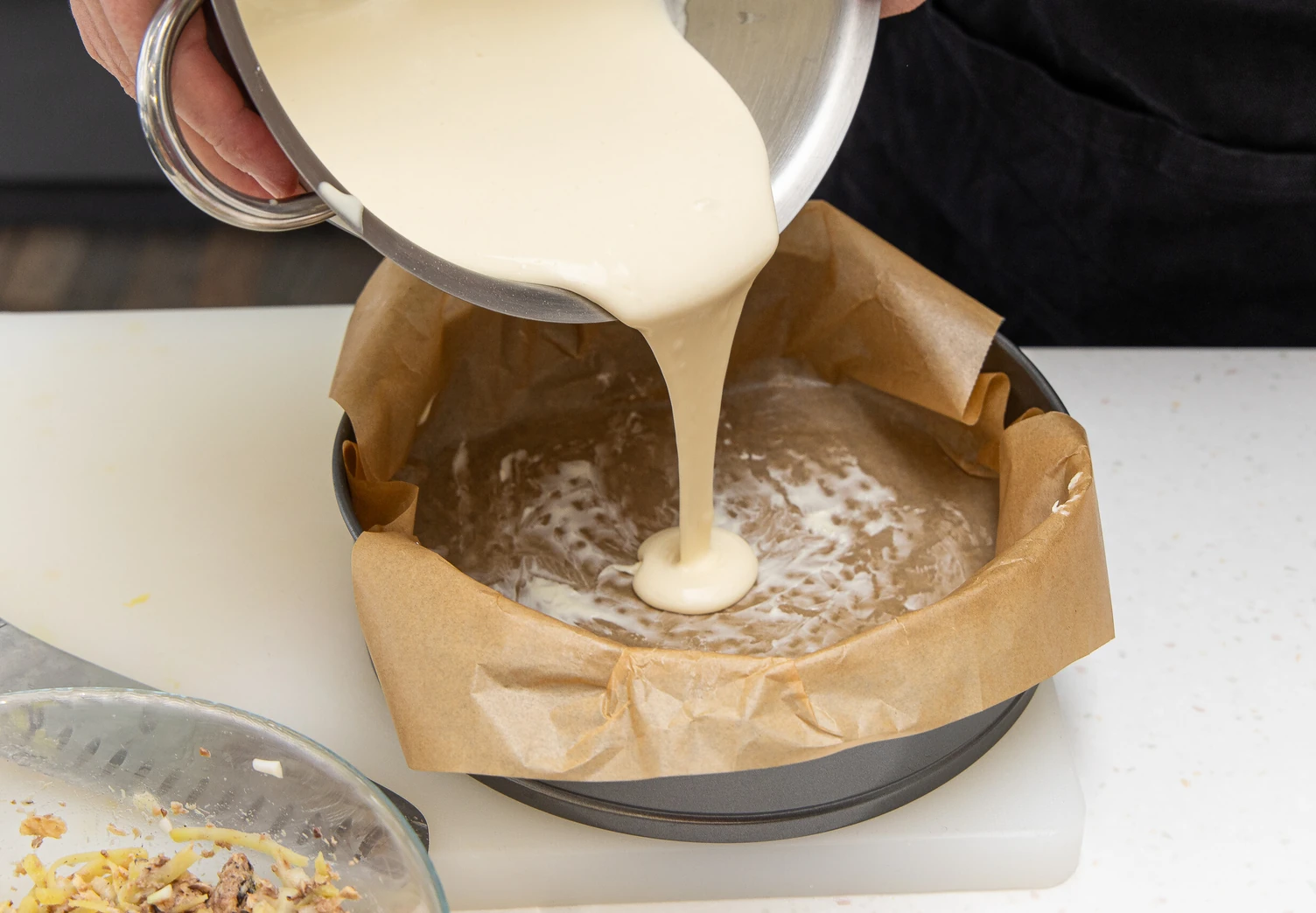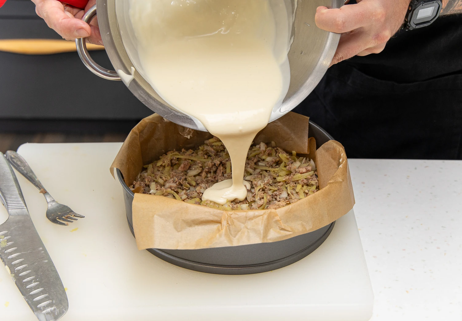 Аккуратно залейте начинку оставшимся тестом, помогая себе ложкой, чтобы оно распределилось равномерно.