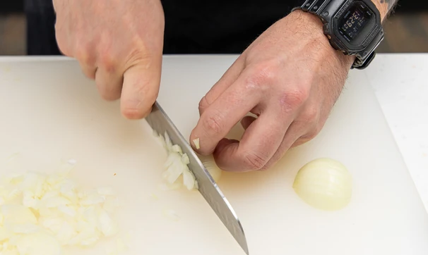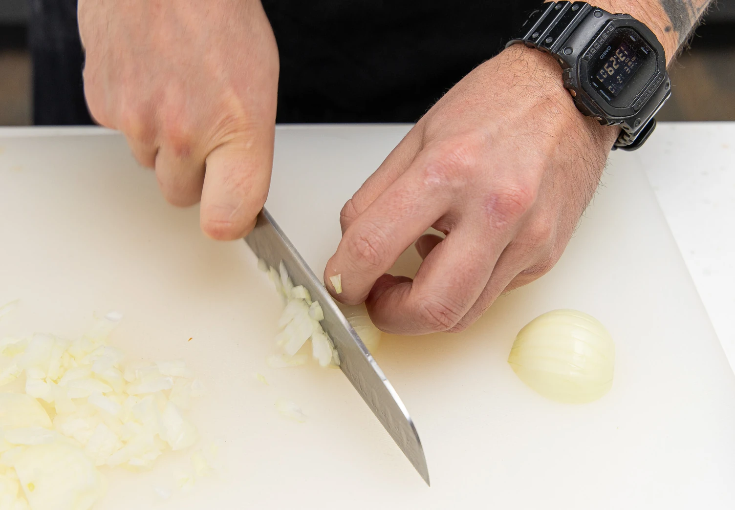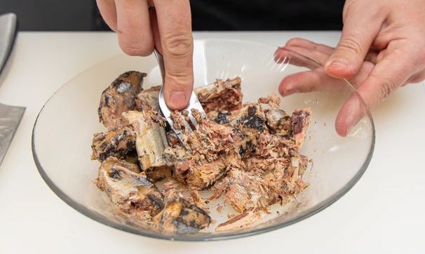 Сайру из банки переложите в миску и разомните вилкой на средние кусочки.