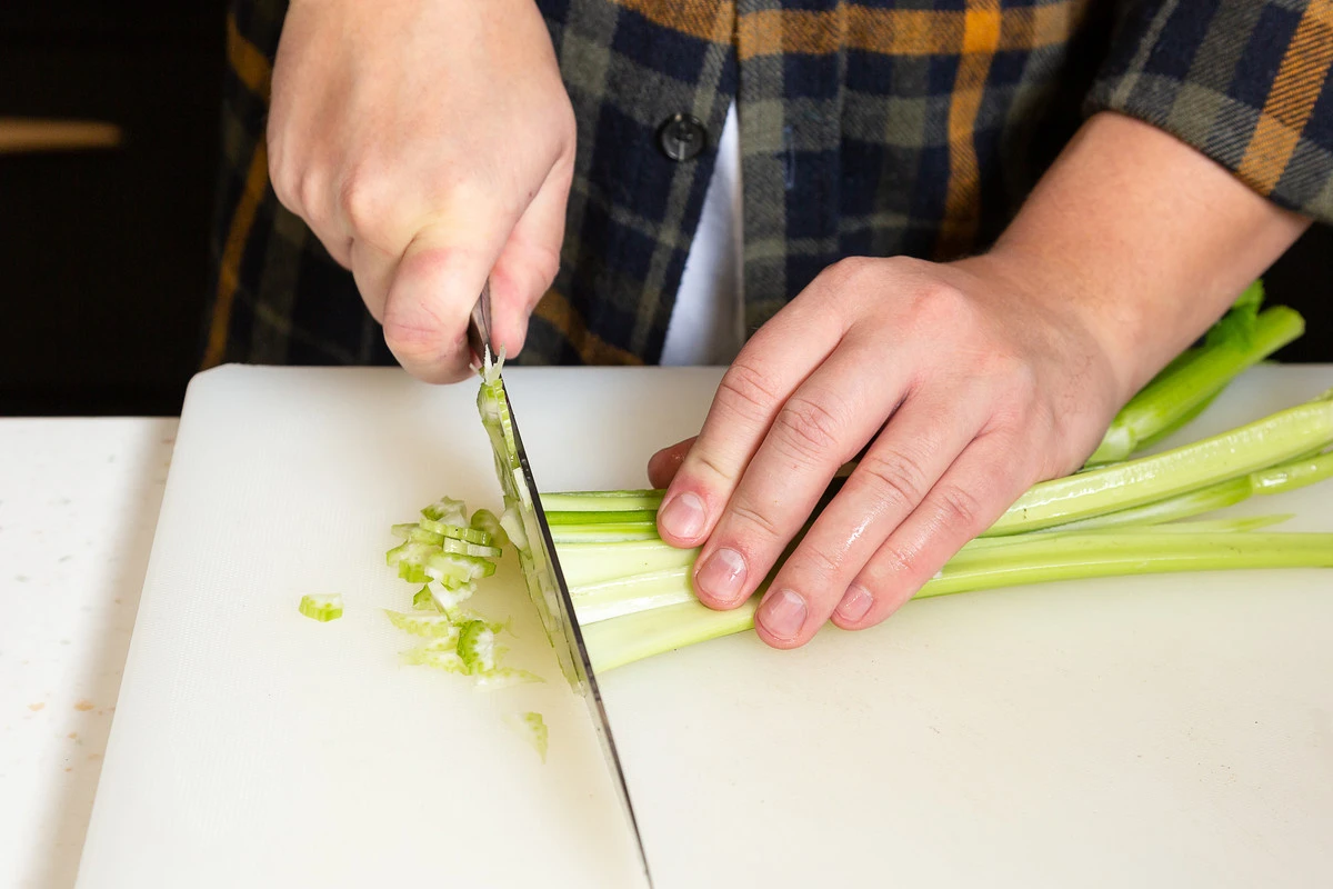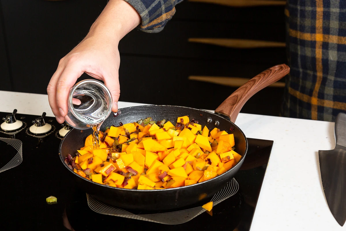 Мелко нарежьте чеснок и свежий розмарин (можно заменить 1/4 ч. л. сухого розмарина). Добавьте сельдерей, тыкву, чеснок и розмарин к луку. Налейте 100 мл воды и тушите всё вместе до золотистого цвета и мягкости тыквы, периодически помешивая. Посолите по вкусу.