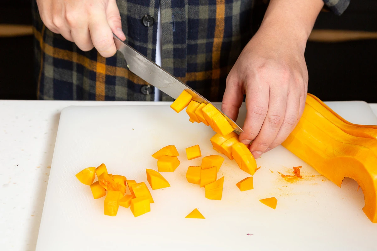 Тыкву почистите и нарежьте кубиками размером примерно 1х1 см.