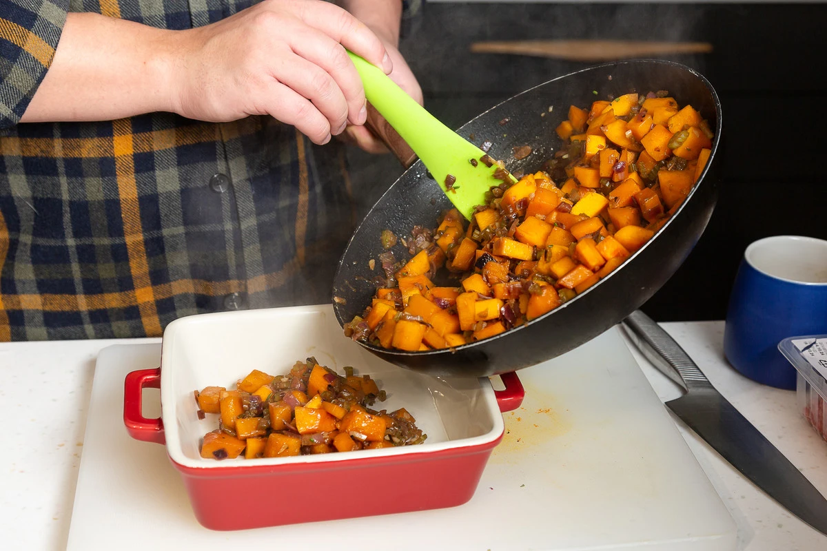 На самом деле, это почти пирог. Сначала мы обжариваем овощи и говяжий фарш отдельно на сковороде до золотистости, а затем запекаем в духовке, накрыв «крышкой» из слоёного теста. Получается сытно, вкусно и очень по-осеннему! Попробуйте.