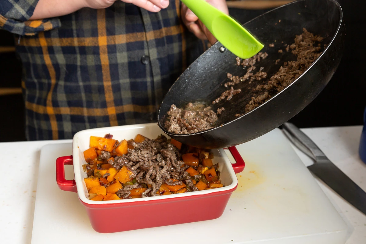 Разогрейте сковороду с 1-2 ст. л. растительного масла, выложите фарш и обжарьте, периодически помешивая, до золотистой корочки. Посолите и поперчите по вкусу. Выложите фарш в форму для запекания поверх овощей.