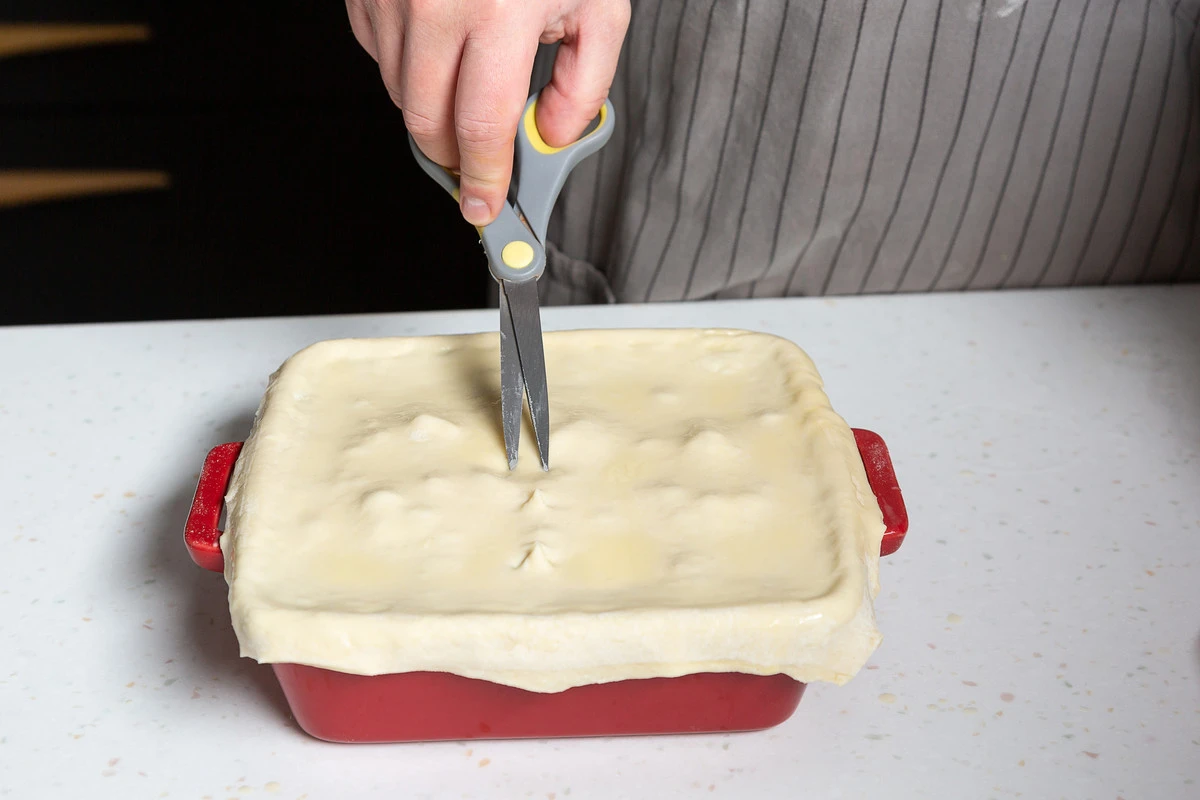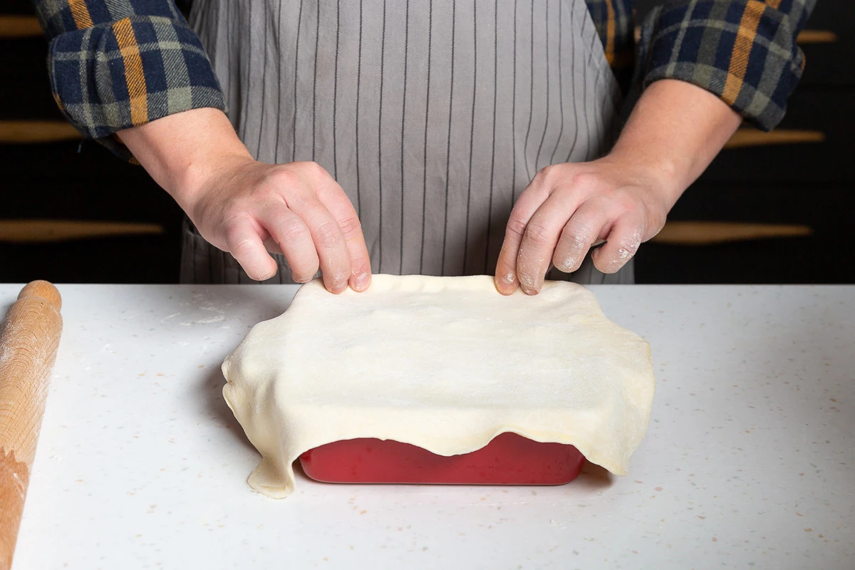 Пласт теста слегка раскатайте в одном направлении и накройте им форму с овощами и фаршем. Прижмите края к краям формы.