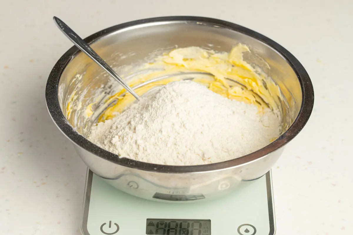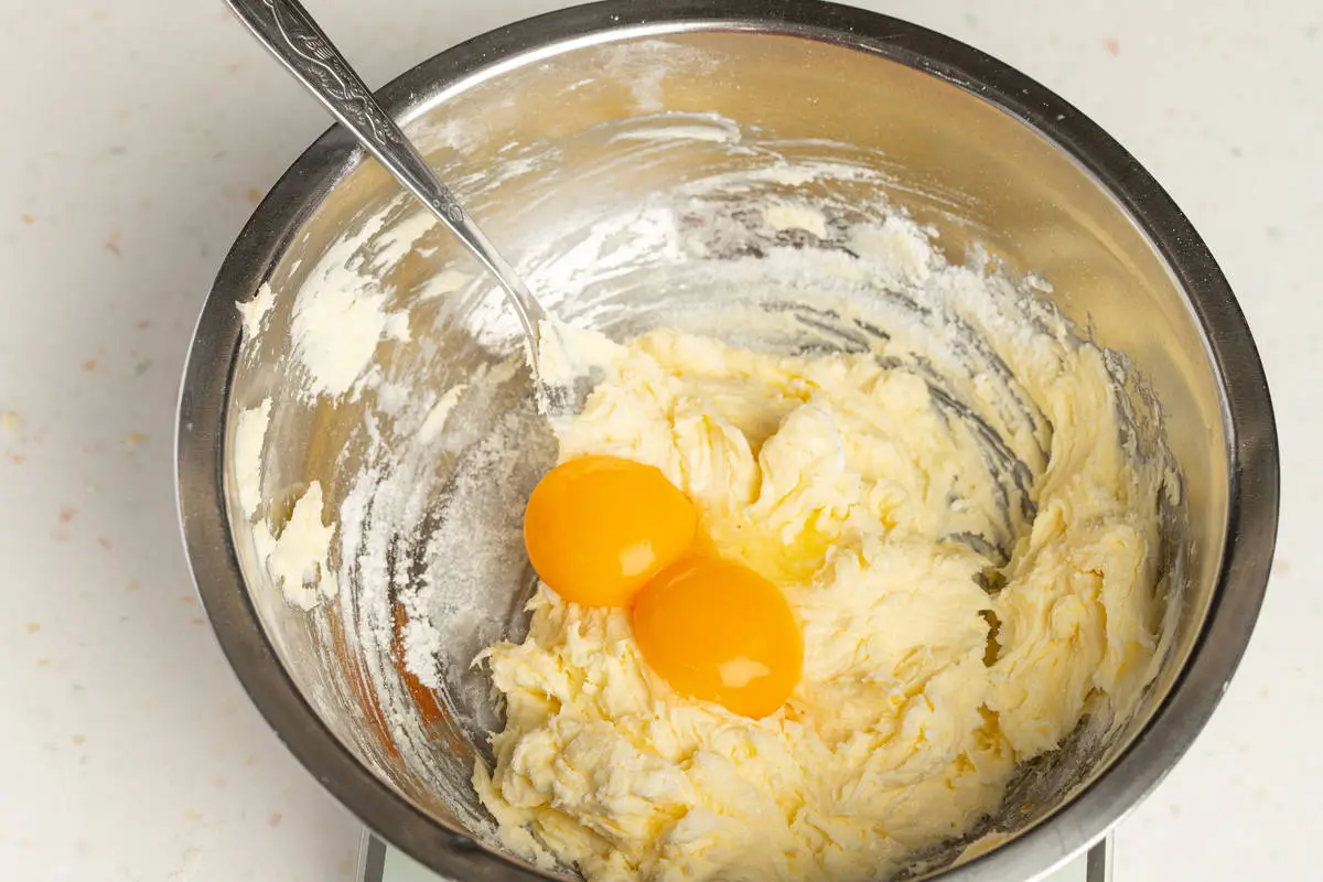 Затем просейте муку и аккуратно перемешайте всё вилкой. Не месите долго, чтобы тесто не стало жёстким, достаточно просто соединить все ингредиенты до однородности.