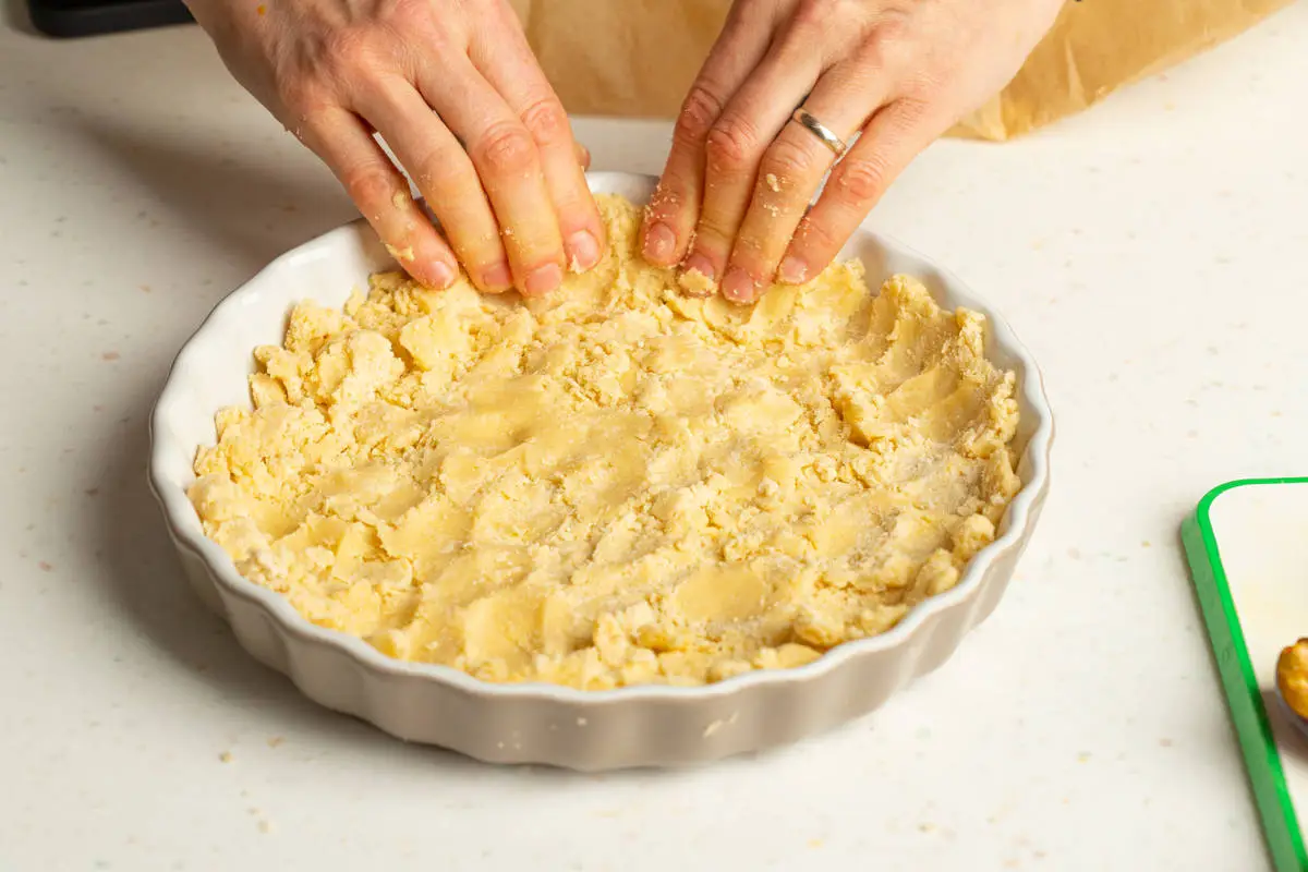 Тесто аккуратно раскатайте между двумя слоями пергамента или просто распределите руками по форме для выпечки. Форма может быть круглой диаметром 29-30 см, но можно раскатать тесто в прямоугольник и просто выложить на противень на бумагу для выпечки.
