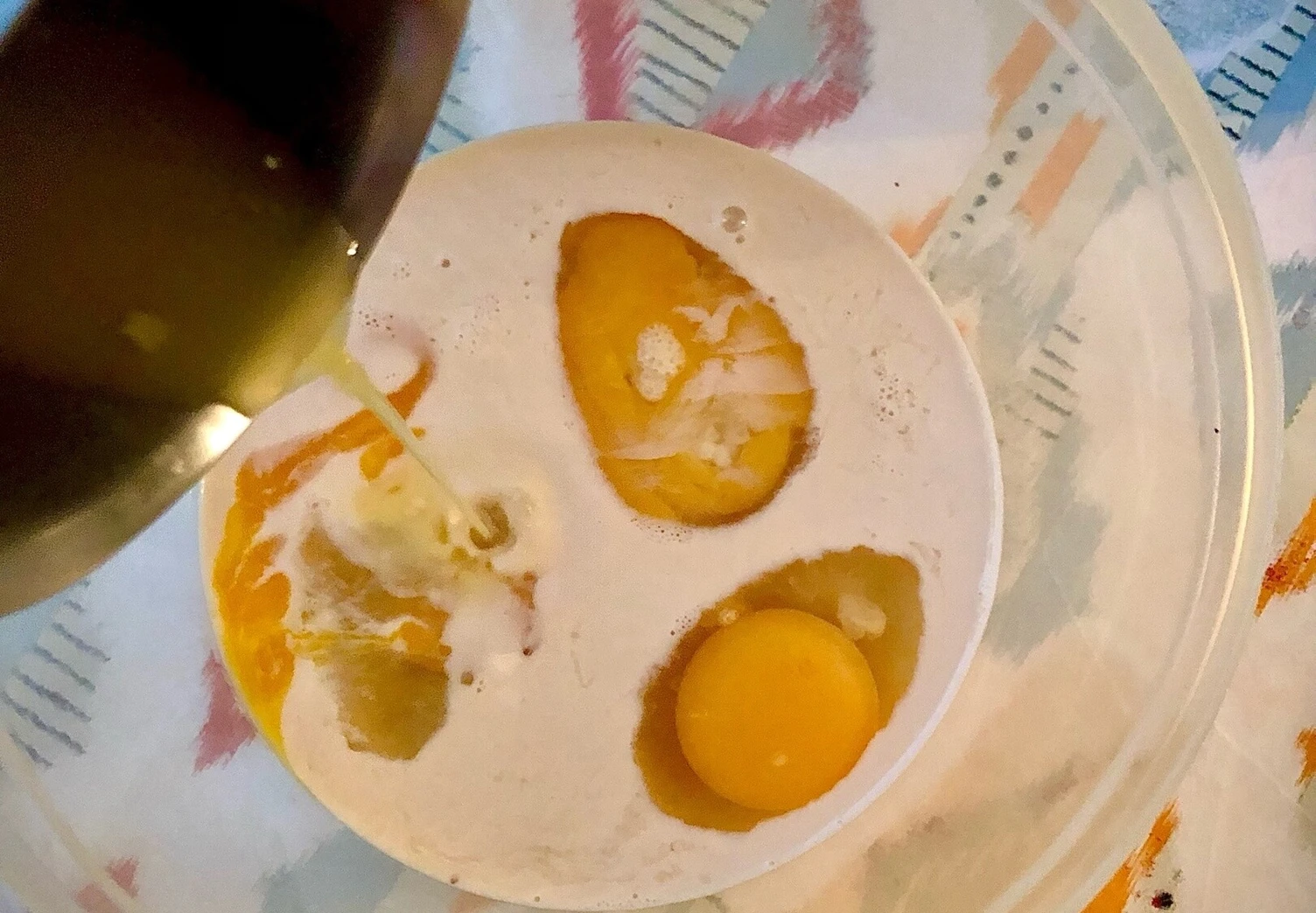 Взбейте яйца, молоко и мягкое масло с сахаром.