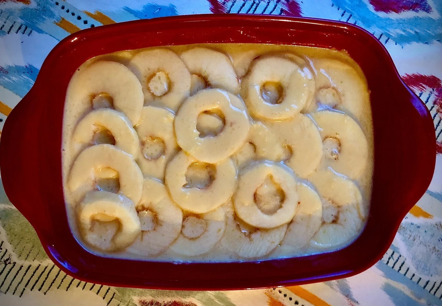 Смажьте форму маслом, выложите яблоки, залейте тестом.