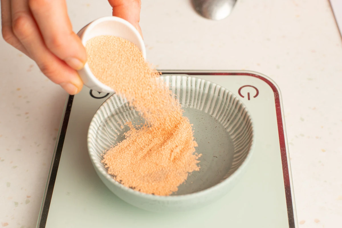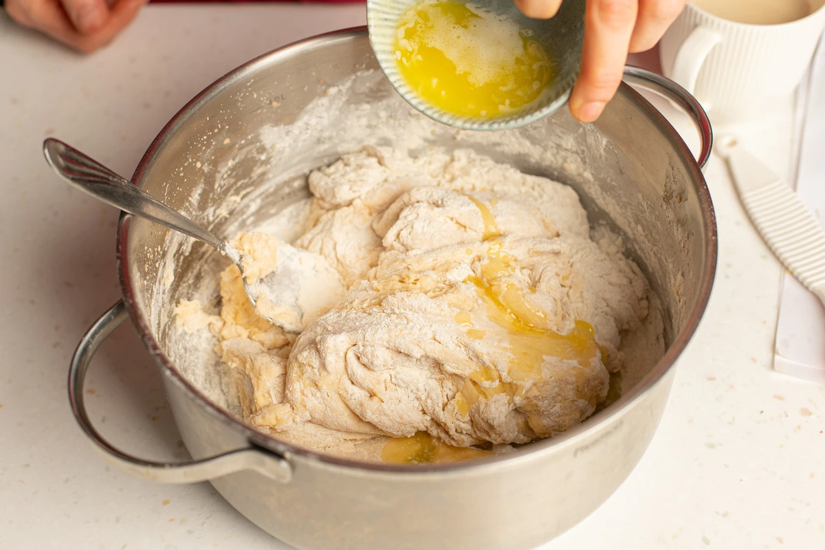 Затем вмешайте ещё 100 г муки и растопленное сливочное масло и оставьте на 30 минут.