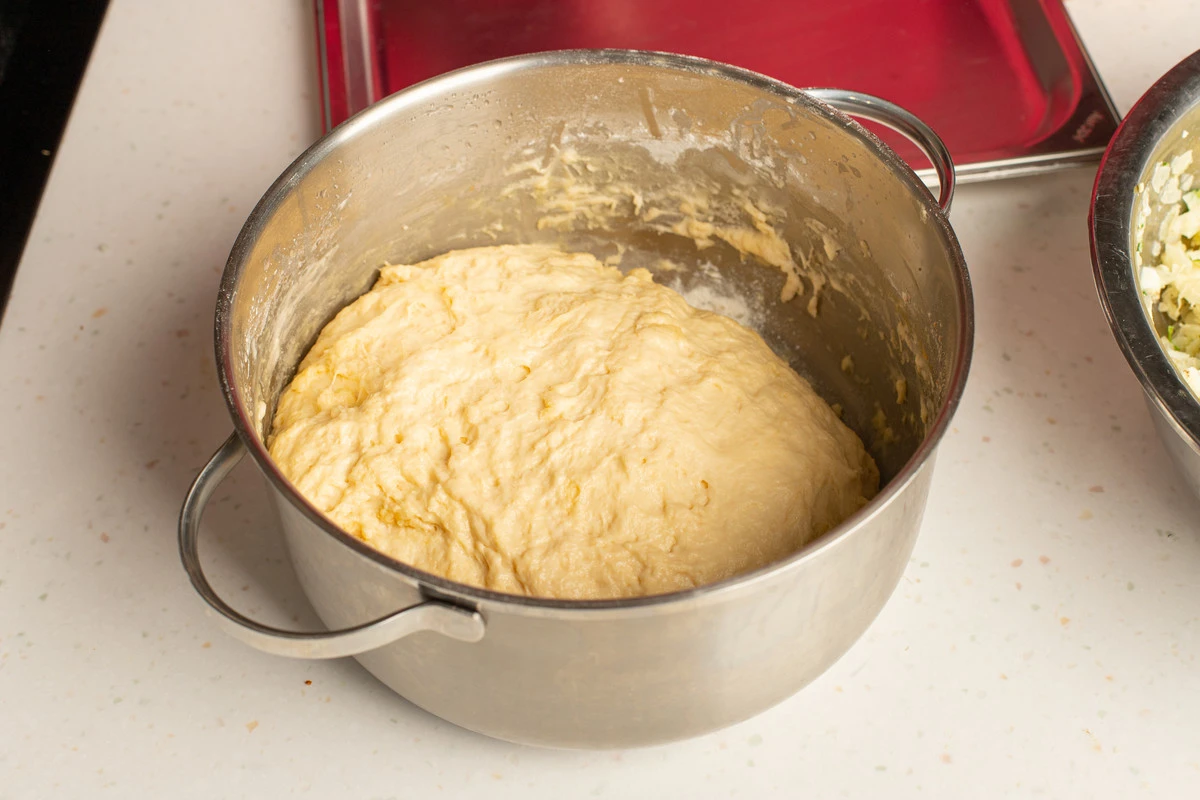 Добавьте 400 г муки и замесите тесто. Не переусердствуйте с мукой: чем сырое тесто будет «жиже», тем мягче оно будет после приготовления пирожков. Оставьте его под крышкой в тёплом месте на 30 минут.